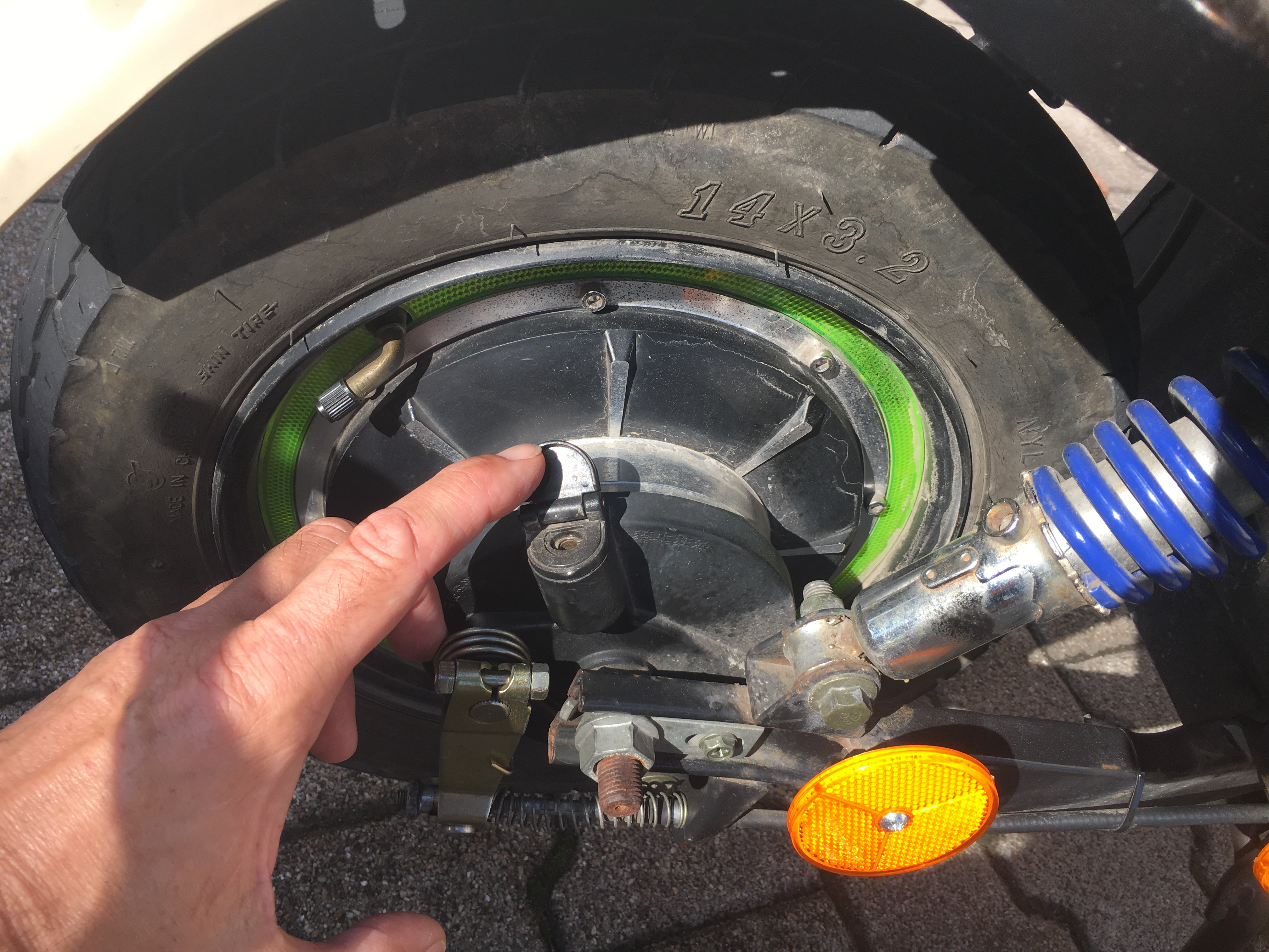 Den Auswuchs am Hinterrad habe ich so auch noch nie gesehen. Da er genau auf der Trommelbremse sitzt, würde ich aber darauf tippen, dass hiermit die Trommelbremse nach Belagverschleiß nachgestellt werden kann. Nachstelleinichtungen sind an Trommelbremsen jedenfalls oft vorhanden.