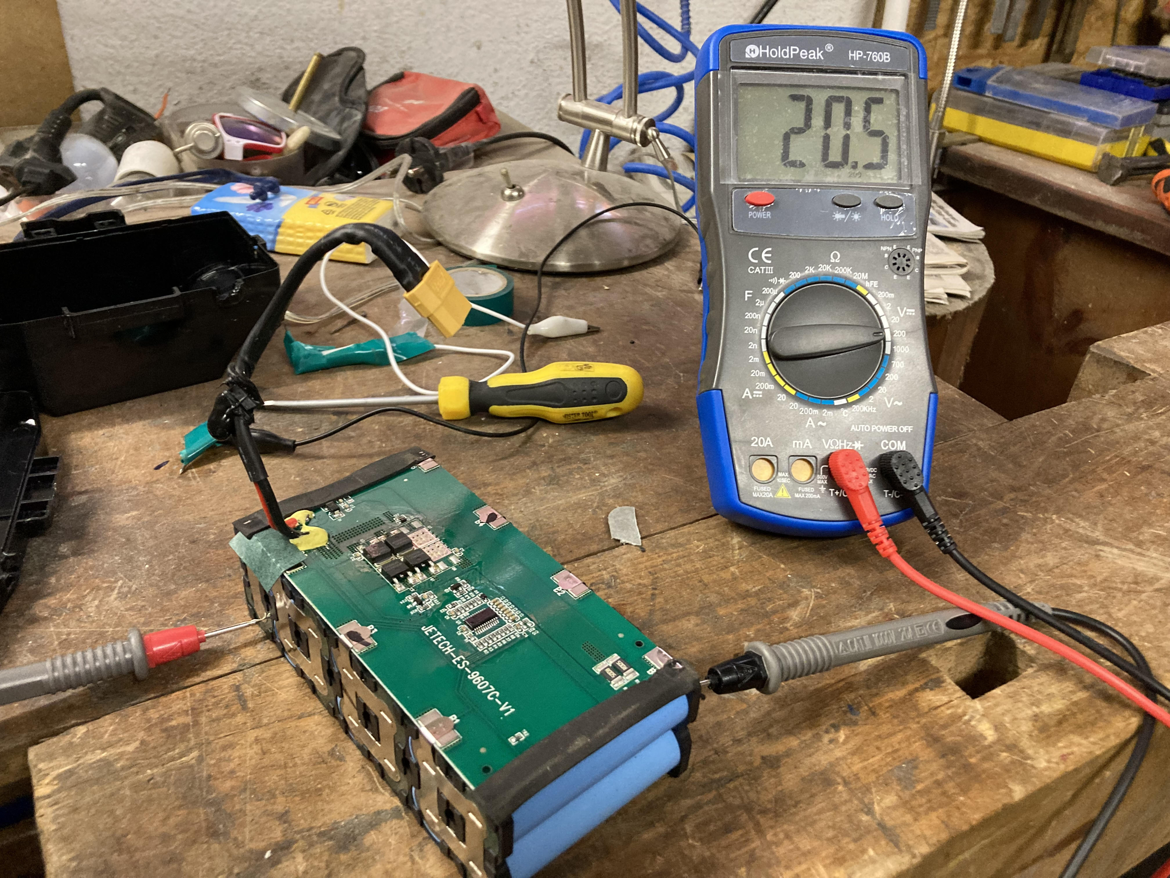 Bei einem 24V Li-Ion akku sind 7 Zellen in Reihe verbaut, Wenn der Akku jetzt nur noch 16V hat, dann ist entweder mindestens eine Zelle komplett tot (0V) und die anderen bei 2,6V, was auch schon sehr hart an der Grenze ist, oder alle Zellen haben eine Spannung von 2,3V was echt nicht mehr schön ist. Selbst wenn du den Akku wieder zum laufen bekommst, das BMS sollte sowas eigentlich unterbinden. Ich kann dir nur empfehlen, den Akku auszutauschen, um mögliche Volgeschäden zu vermeiden. Vor allem würde ich einen Akku ohne nachweislich funktionierendes BMS nicht über Nacht laden lassen, eine Überspannung der Zellen nehmen Li-Ion akkus einem sehr übel.