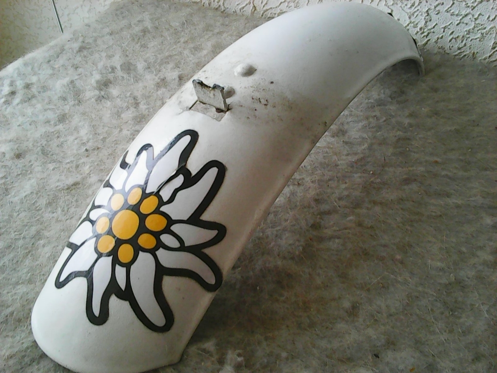 Bevor ich die Schraube wechseln wollte, hatte ich aus Zeitgründen vor Fahrtantritt versucht, die vorhandene Schraube ganz leicht nachzuziehen. Und Peng! Das Resultat: Der Halter oben ist mittig gebrochen. Nun gut, dann halt ohne vorderes Schutzblech zur Physiotherapie. Und als ich da so im Warteraum saß, kam zufälligerweise ein Anruf aus Bruchsal mit einer Danksagung zu meinem Akkutestbericht. Habe dann mein heutiges Problem geschildert. Umgehende Zusendung eines neuen, vorderen Schutzbleches wurde mir zugesagt, sobald deren Schutzbleche beim Lackierer waren. Darauf habe ich dankend verzichtet, weil das Schutzblech ja sowieso weiß lackiert wird. Also, es gibt demnächst reichlich zu tun.