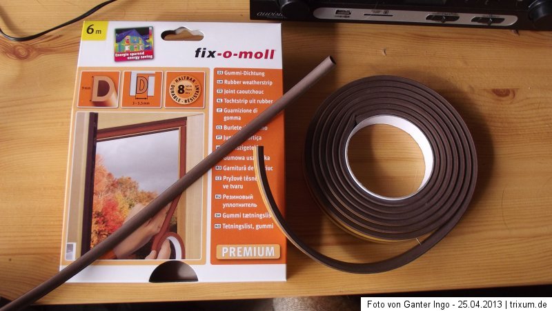 Um ein Klappern des Metallbrettes auf dem Rahmenkasten zu vermeiden und um auch Schutz vor eintretender Nässe zu gewährleisten, habe ich mir im Baumarkt eine Rolle fix-o-moll gekauft.