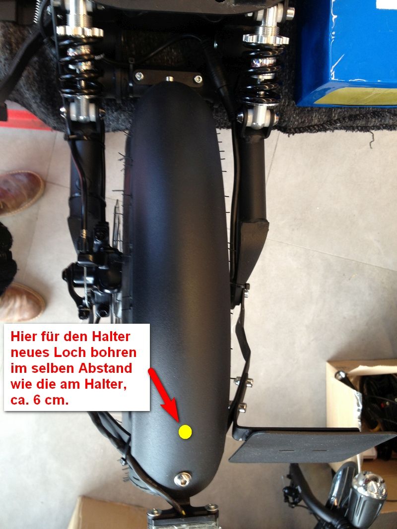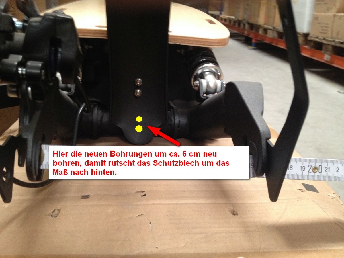 Bezüglich des Spritzschutzes: Dieses Problem kann man ganz einfach selber lösen. Dazu muss allerdings das Hinterrad ausgebaut werden. Das Schutzblech ist hinter dem Rad an der Befestigung nach unten hin ca. 8 cm länger. Wenn man nun das Schutzblech entfernt und die Bohrungen für den Halter und den Bügel z.B. um 6 cm versetzt, so rutscht dieses nach der Montage um dieses Maß nach hinten. Wenn jetzt noch Wasser vom Hinterreifen weg spritzt, dann viel weiter tiefer und eine Belästigung von nachfolgenden Zweiradfahrern oder Fußgängern dürfte nahezu ausgeschlossen sein. Siehe Bilder.
