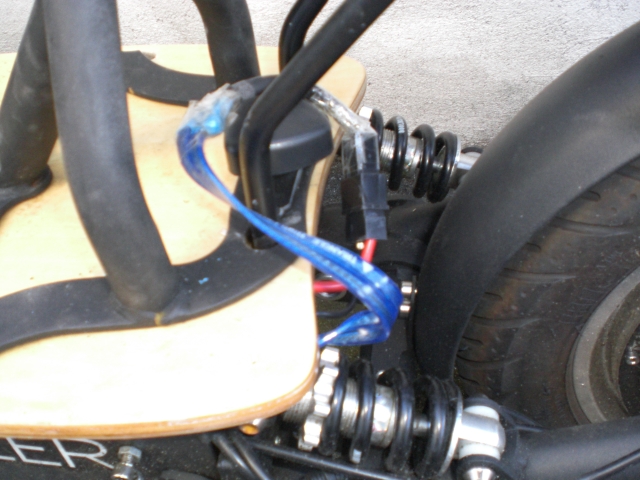 Den Originalakkusatz habe ich im Kasten innerhalb des Revoluzzer um 180 Grad gedreht, so dass ich Zugriff auf dessen Stecker nach hinten habe. Das blaue Kabel (siehe vorherige Beiträge) habe ich als Verlängerung vom Anschluss an den Controller ebenfalls nach hinten hinaus geführt. Wenn ich mit dem Originalakkupack fahren will, verbinden ich Stecker und Buchse (siehe Bild).