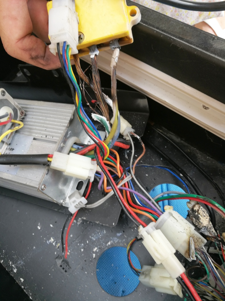 2. habe ich beim Abbauen das Stromkabel des Nabenmotors ausgebaut. Beim Öffnen der Abdeckung vor dem Batteriefach stellte ich fest, dass es einen massiven Kabelbrand (offensichtlich mit grösserer Hitze-Vermutung) an verschiedensten Kabeln gegeben hat. Selbst Stecker sind an- und zusammengeschmort. Ein Wunder, dass der Roller überhaupt noch lief???