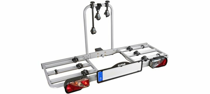Das wäre ein ganz normaler Heckträger für drei Fahrräder. Verstehe ich das richtig, dass über den Schienen für die Fahrräder noch eine Aluplatte war, auf der dann der Revoluzzer steht?