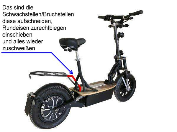 ja man kann ihn abstützen, wenn du da unbedingt ein halbes totes schwein drauf transportieren musst, dann sollte man ganz dringend was tun. die bruchstellen wo das ding gerne bricht aufschneiden und in das dünne rohr schrauben bzw. stahlstifte einschweißen. seitlich würd ich von vorne nach hinten flacheisen anschweißen. dann kannst den auch als schwerlasttransporter mißbrauchen. tust du nichts wirst du damit jämmerlich baden gehen. selbst mit nur einem akku hinten drauf wird der abknicken. unterwegs haste dann richtig spaß