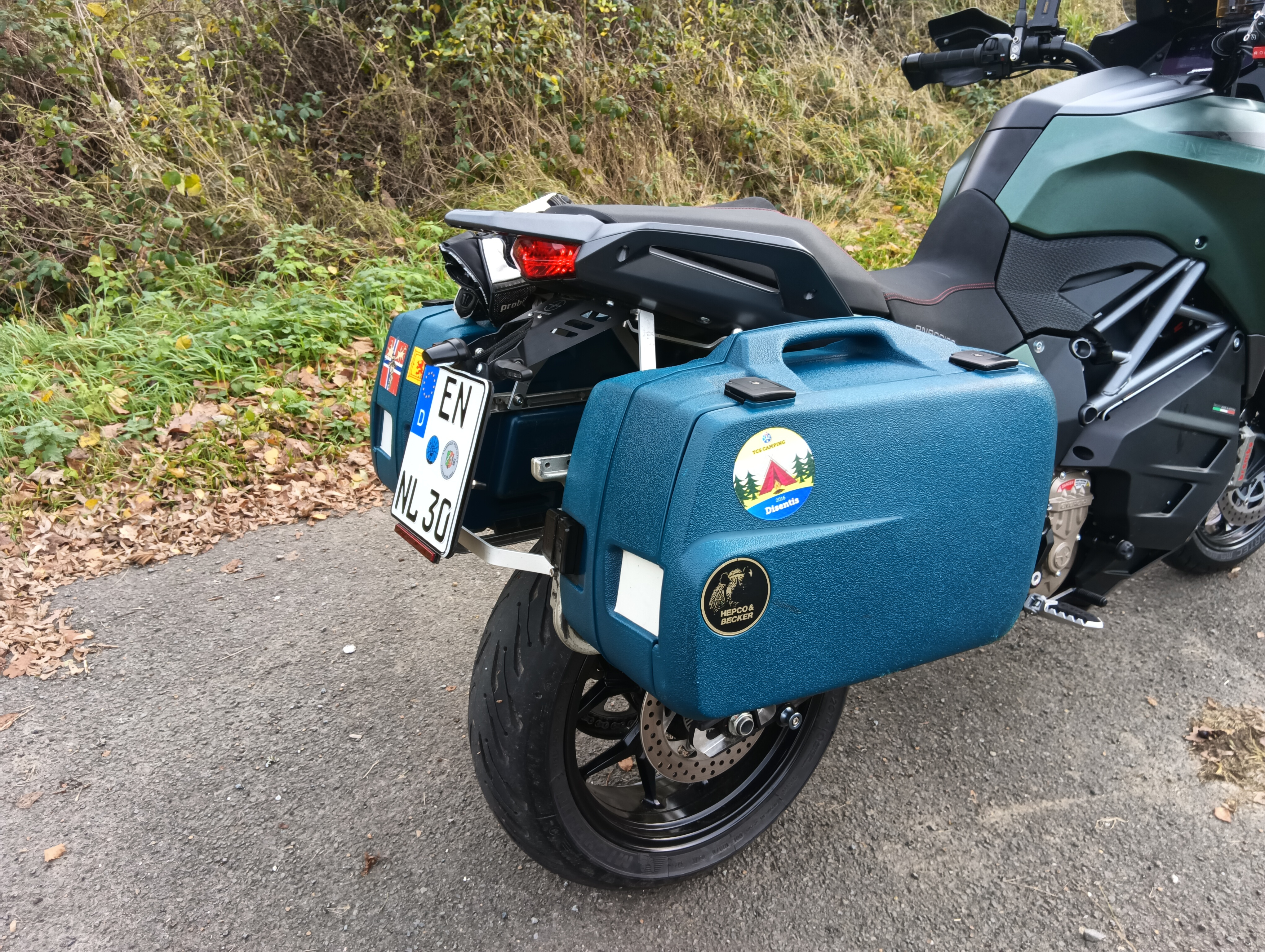 Die sahen neu schon Ende der 80er in der Farbe schon scheiße aus! Aber dafür habe ich die damals auch für 200 Mark neu gekauft, weil die keiner haben wollte. Und das sind Top Koffer, dicht wie am erstenTag, wahnsinnig robust und einfach praktisch. Ich hab nie irgendwelche Hersteller-Koffer gekauft, die Hepcos hab ich immer ans Motorrad bekommen.