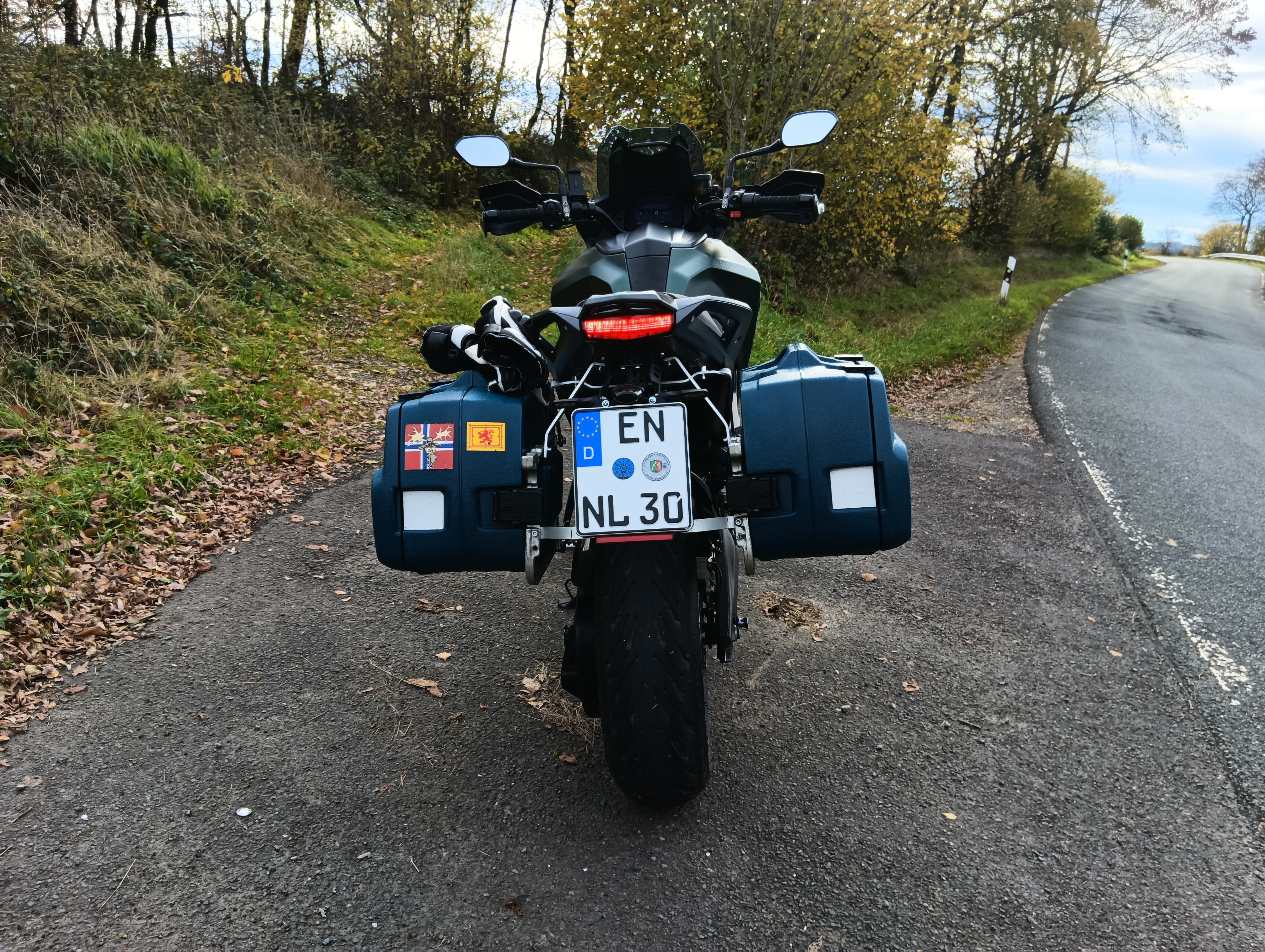 Das einzige, was mich derzeit irritiert ist derzeit, daß bei Rad drehen lassen die rote Anzeige der Traktionskontrolle / ABS blinkt und das Rad nicht schneller wird und anstatt dessen intervallartig schnell und langsam wird (schwer zu beschreiben). Ich vermute und hoffe aber, daß das daran liegt, daß die Traktionskontrolle verwirrt ist, weil ich das Motorrad auf dem Montageständer hochdrehe und sich das Vorderrad gar nicht dreht.