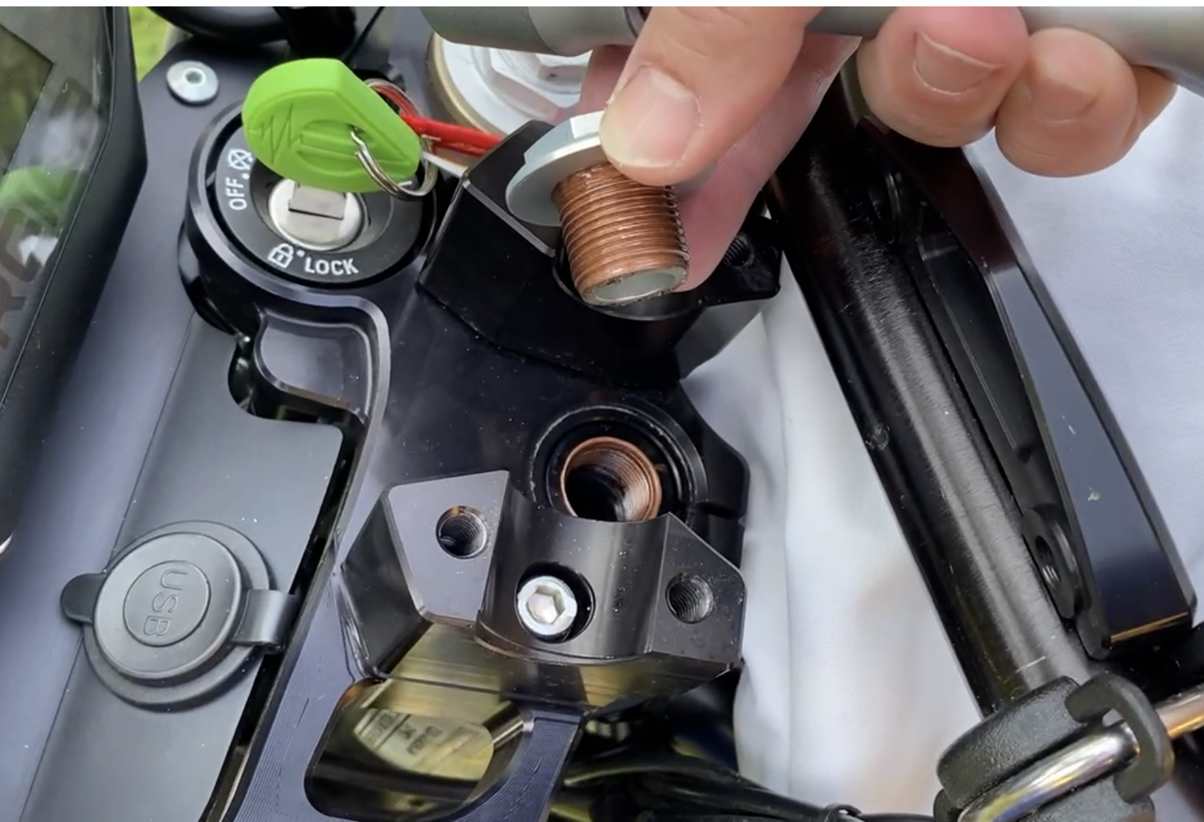 Die Esse hat nur einen Seitenständer. Obschon der 21.5kWh-Akkublock eine Anschraubposition und Bauraum für einen Hauptständer bieten würde, gibt’s den auch nicht gegen Aufpreis vom Hersteller. Der Seitenständer ist sehr gut zu erreichen, man muss kein Fußyoga beherrschen. Hinten habe ich Bobbins für eine Aufnahme eines Montage-Ständers eingeschraubt (8mm Gewinde sind in der Schwinge), für vorne habe ich mir einen Kern-Stabi X4 Frontständer gekauft. DER ist klasse! Er greift per Konus von unten in den Lenkkopf ein und wird per 13’er Nuss hoch- oder runtergekurbelt. Die Position des Ständers am Boden bleibt unverändert – das vermittelt eine unglaublich hohe Stand-Sicherheit!
