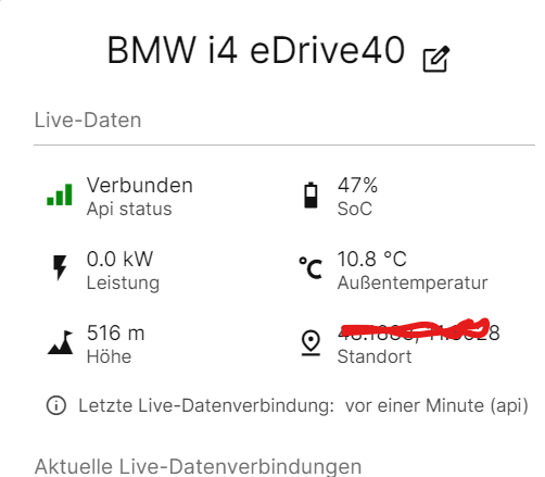 Abetterrouteplanner.com: Während der Fahrt und während des Ladens ein Datensatz alle 60 Sekunden. Die Verbindung erfolgt über die Live API. SOC, Ladespeed, Außentemperatur, Standort und Höhe sind über die ABRP App oder Webseite abrufbar und werden in der Routenplanung berücksichtigt.