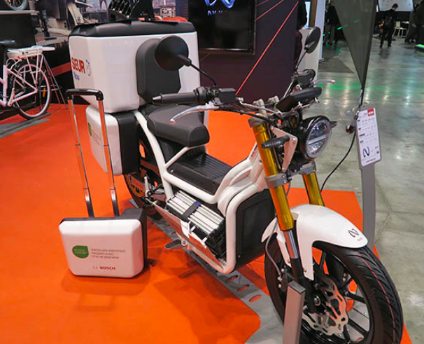 "Standardmäßig ist der Rieju Nuuk mit einem Ladegerät ausgestattet, das an eine herkömmliche Steckdose angeschlossen werden kann. Jedenfalls hat Bosch den Fast Charge-Modus vorbereitet, mit dem wir 1 Batterie (2.400Wh) in nur 1 Stunde zu 80% aufladen können."