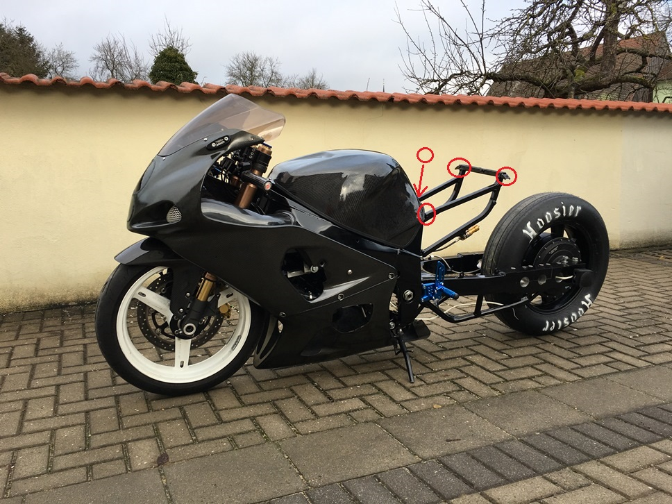 Das Heck wird mit 4 Schrauben befestigt. Das wird reichen. Mehr Befestigungspunkte gibt es bei den Rennkisten auch nicht. Bin ja auch nur Solo damit unterwegs.