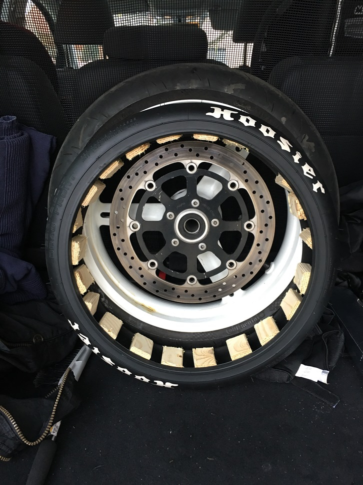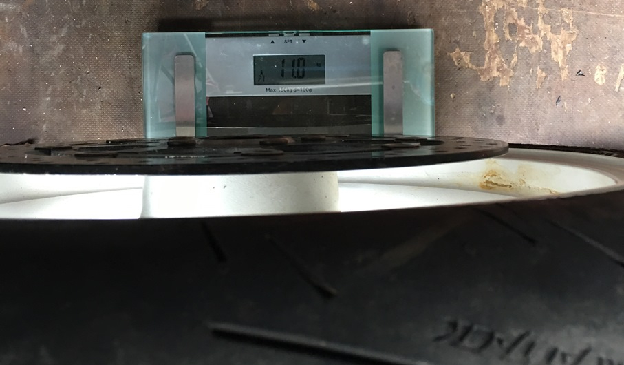 Gestern die Bremssysteme entlüftet, das Vorderrad ausgebaut und mit aktueller Bremsscheibenkonfiguration (rechte Seite Originalbremsscheibe, linke Seite Abdeckung an der Felge und Original Bremsscheibenschrauben) und 120/70-17 VR gewogen.