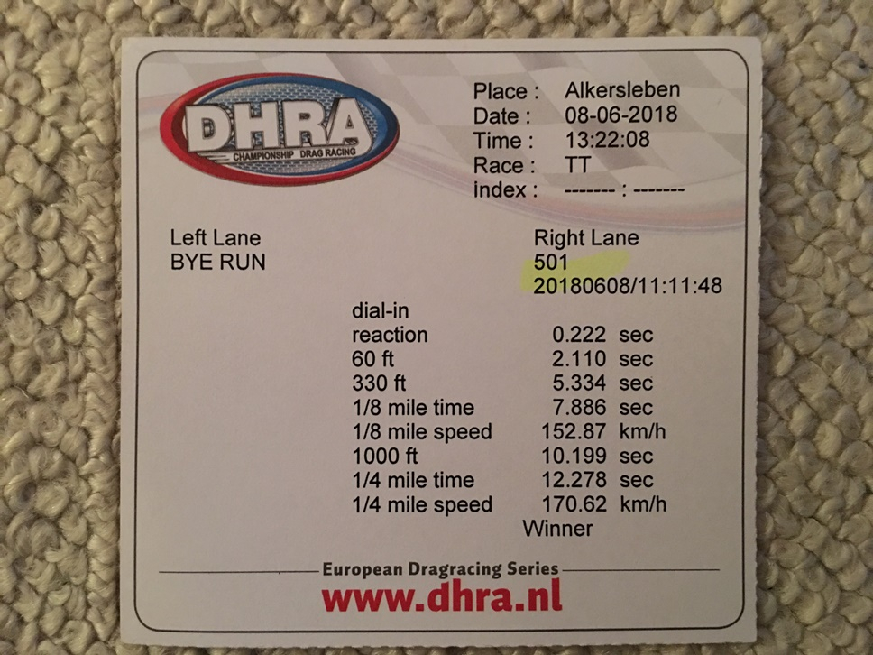 Bei der 1/8 Meile habe ich nun grundsätzlich um die 150km/h drauf und bei dem Lauf waren es dann am Ende nur noch 144 km/h. Konnte aber dank meiner besseren Reaktion am Start und der besseren 60 Fußzeit daqs Rennen dann dochg noch für mich entscheiden.