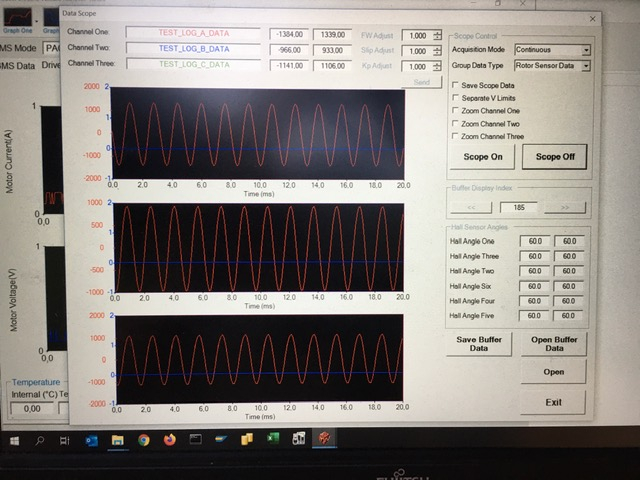 Jetzt soll ich überprüfen ob der Resolver wirklich nur ein Polpaar hat (durch drehen des Motors) und beobachten der unteren beiden Graphen. Der obere bleibt unverändert.