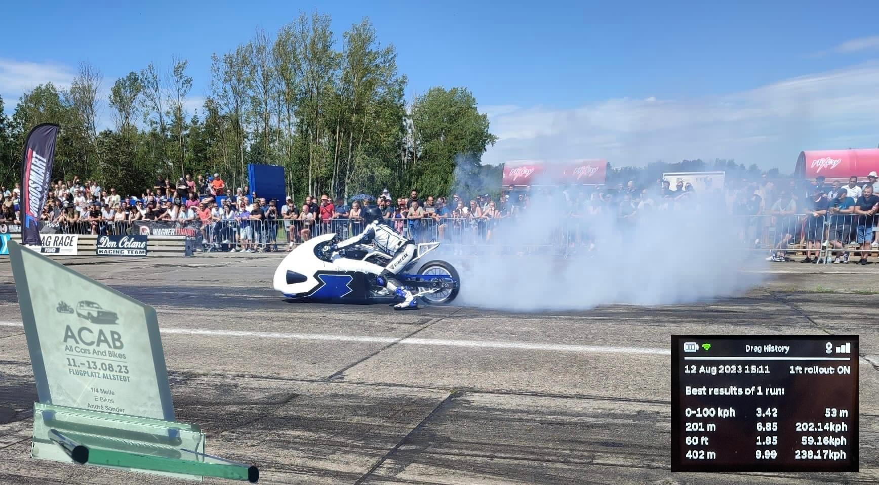 Beim 3. Lauf, wo ich mein bestes Ergebnis erziehlt habe, hatte ich nicht nochmal geladen. Topspeed, nach 402m war annähernd gleich. Gegen einen 1020 PS Tesla hätte ich keine Chance gehabt. Der war 0,3 Sekunden schneller. Da ich einziger E Motorradfahrer war habe ich den 1. Platz gemacht