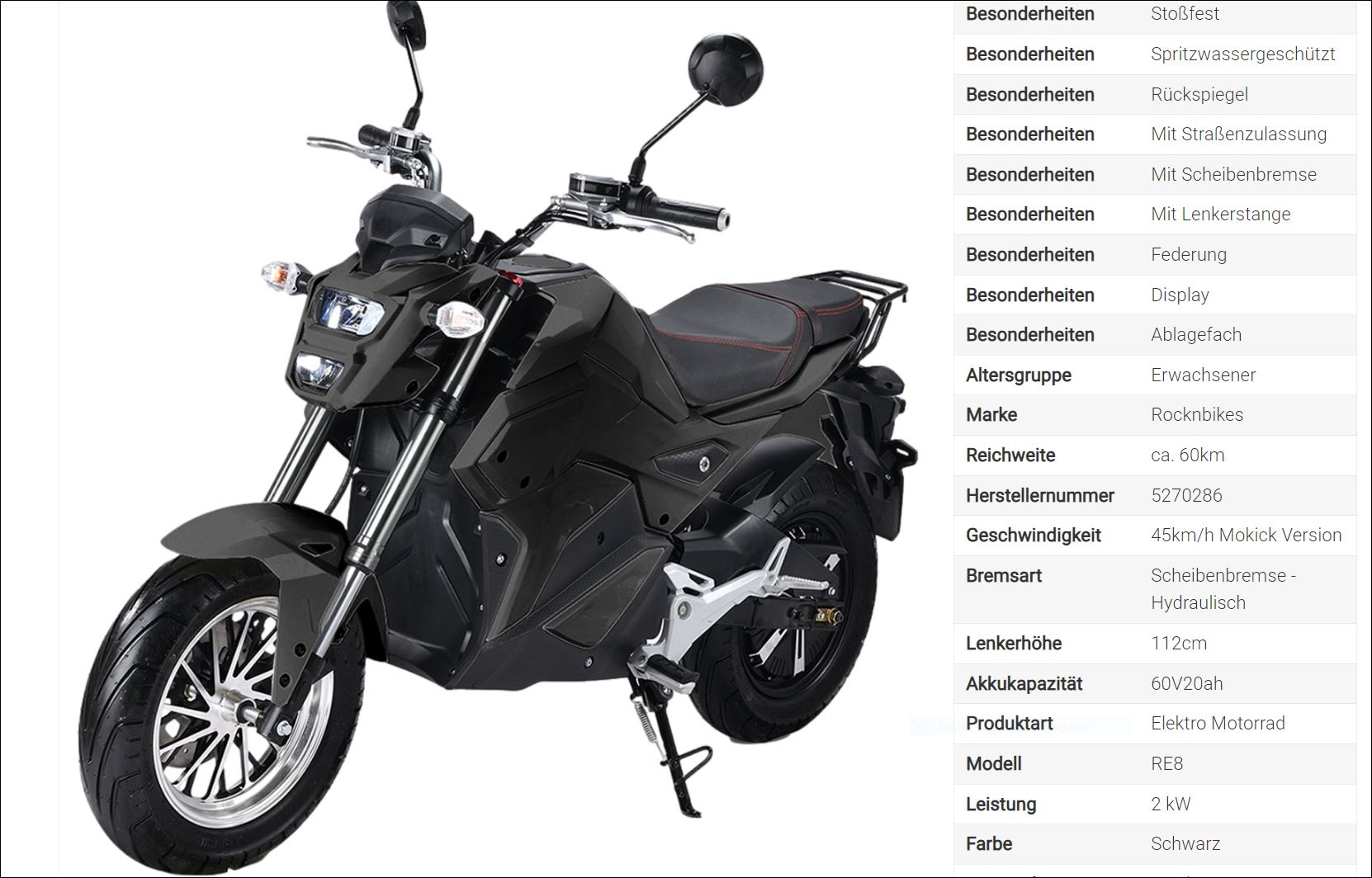 Re: Elektro Motorrad RE8 Schwarz 45km/h 72V20Ah Lead Accid Alufelgen