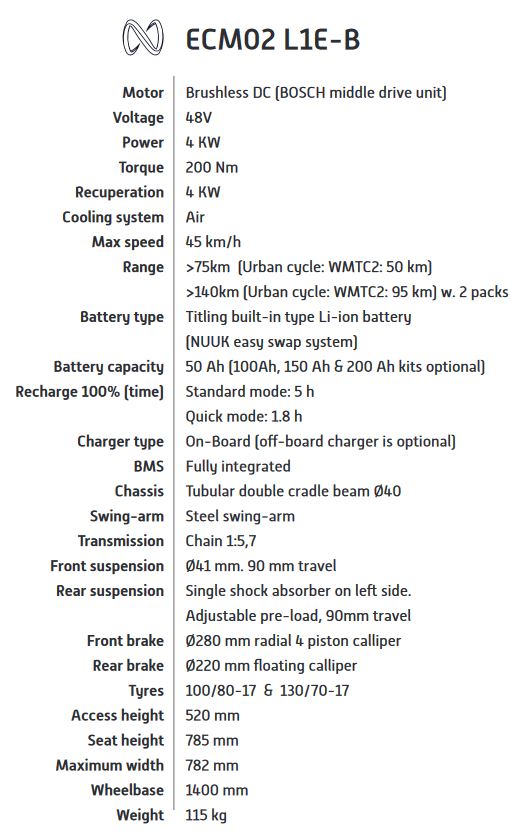 Die Fahrzeuge (mit einem Gewicht zwischen 115 und 130 kg) sind mit einer Kapazität von bis zu vier Batterien von 50 A ausgestattet und verfügen somit über eine Reichweite von mehr als 300 km. Ihre Aufladung hat zwei Möglichkeiten: normales Laden und Schnellladen (QuickMode), kann in seiner Version von 10,5 KW eine Höchstgeschwindigkeit von 100 km / h erreichen, das System der Dämpfung hat eine umgedrehte Gabel und montiert Räder mit 17er Felgen Zoll