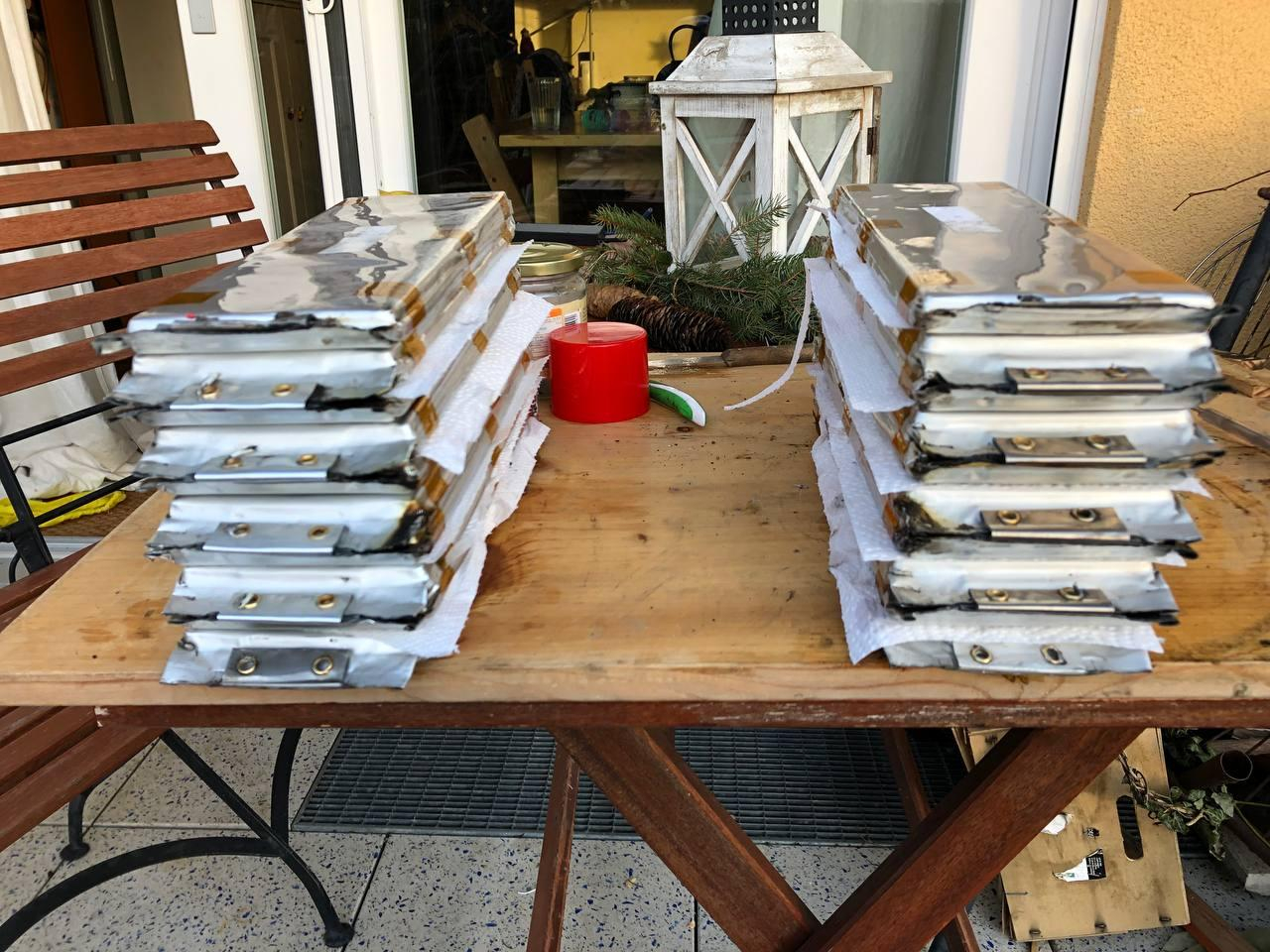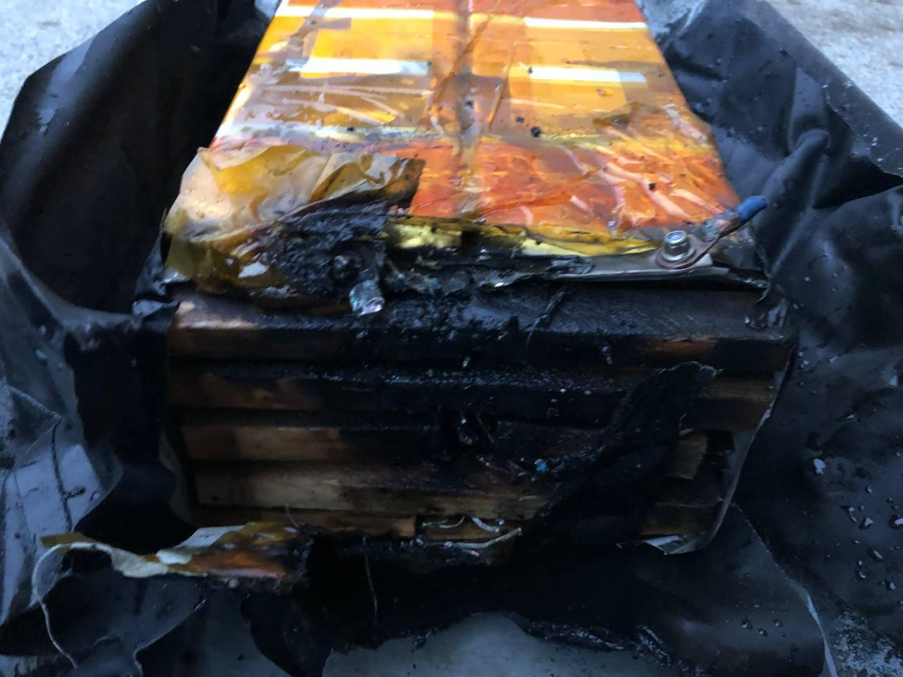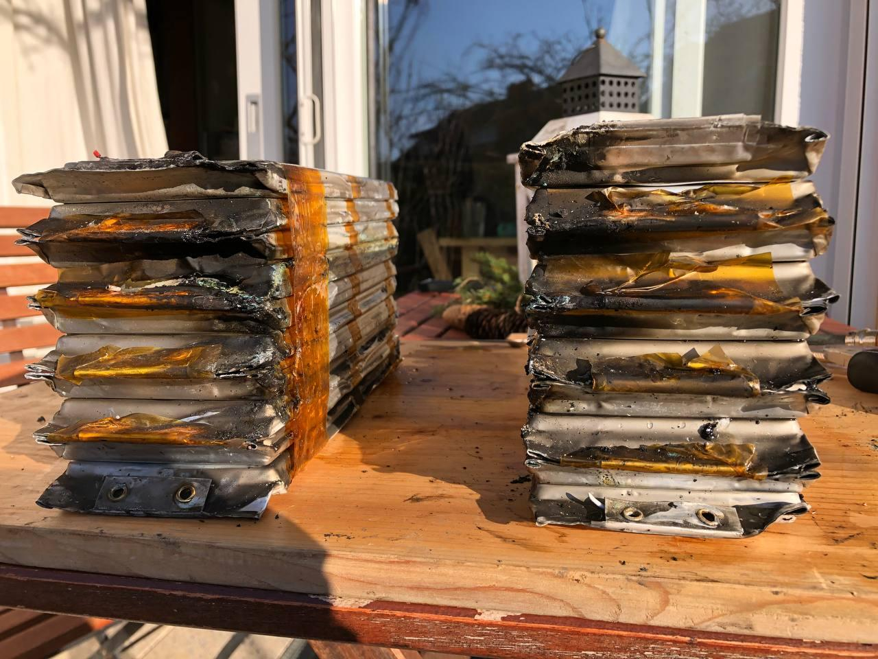 Nach dem sich die Kabel durch andauernden Kurzschluss vermutlich soweit aufgelöst hatten, dass kein Kurzschluss mehr bestand, durfte ich den Akku nach ca. 45Minuten am Einsatzort abholen und mit nach Hause nehmen. Ich gebe zu, dass ist bestimmt keine konventionelle Lösung, aber die Dorffeuerwehr war mit dem Einsatz auch eher überfordert. Man hätte den Akku in ein Wasserbad für LIPO Akkus geben müssen (den diese Feuerwehr nicht hat), das "konterminierte" Wasser hätte fachgerecht entsorgt werden müssen. Da die Zellen augenscheinlich nicht defekt waren und es sich scheinbar „nur“ um einen Kabelbrand handelte, durfte ich den Akku mit nach Hause nehmen. Dort habe ich ihn erstmal ausgepackt, alle BMS Kabel an den Zellen direkt abgeknipst und die Zellen gereinigt. Ich kenne die Ursache nach wie vor nicht, die einzelnen BMS Kabel zu den Zellen müssen sich stellenweise ggf. durch die vielen Vibrationen bei Fahren so aneinander gerieben haben, dass es zu einem Kurzschluss kam.