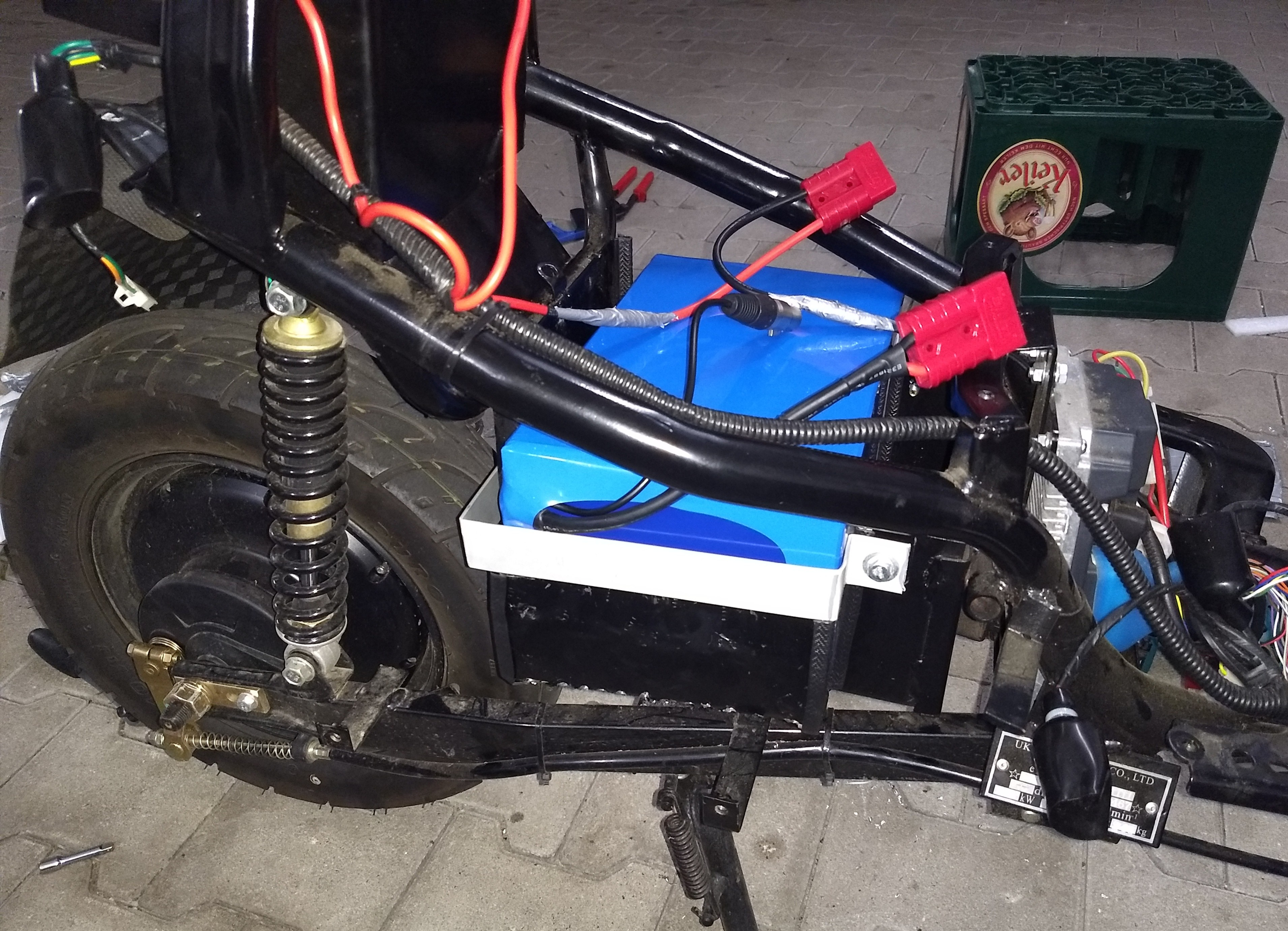 Der Akku sitzt gut, wackelt nicht und ist von allen Seiten gehalten, sodass er nicht Herausrutschen kann. Dazu hab ich mir noch einen Halter aus einer Aluminium Leiste zurecht gebogen. Die Verkabelung war relativ einfach, ein passender Stecker mit Gegenstück war dabei. Nur der Ladeanschluss hat etwas mehr Arbeit verlangt, den müsste ich umlöten, da ich die vorhandene XLR Buchse vom Roller weiter benutzen wollte. Den einzelnen XLR Stecker, der am Akku dran war wollte ich nicht aus der Verkleidung hängen lassen.