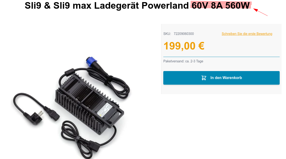 Das LG für den SLI-7 Max und nGt hat 10 A bei 72 V. Also im Mittel 720 W. Max. dann 840 W.