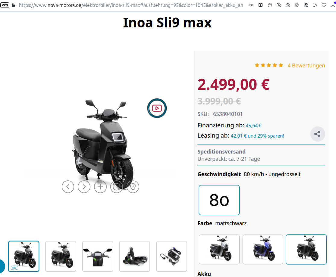 Wollte nur kurz durchfunken, dass der INOA SLI-9 Max derzeit für 2.500 € angeboten wird. Somit 500 € unter dem bisherigen Sonderangebotspreis. Finde ich preislich hochinteressant. Damit ist er, berücksichtigt man den zweiten Akku, sogar bis zu 400 € billiger als Roller der 45 km/h-Klasse wie beispielsweise ein SLI-5 (> 250 €) oder eGT5 (> 400 €).