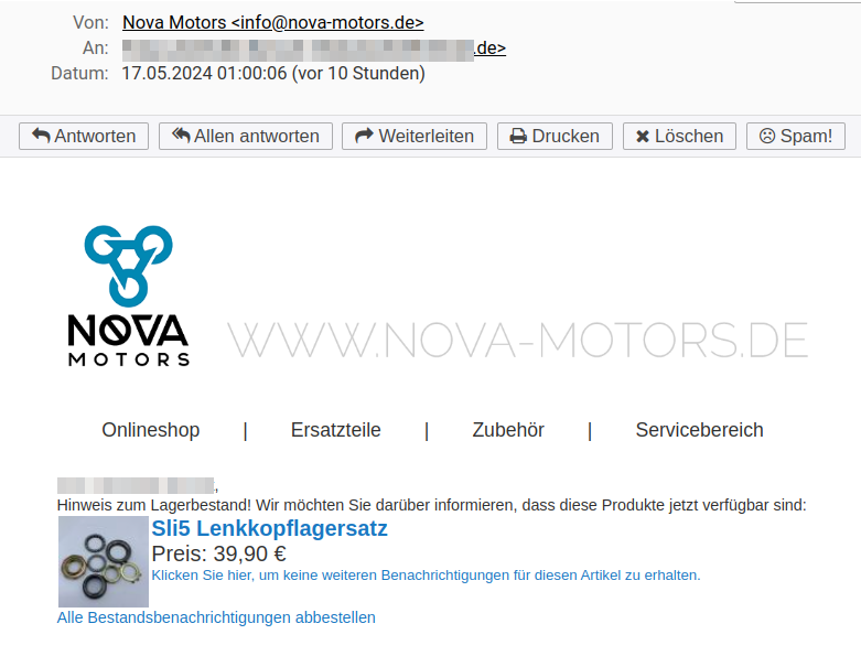 Bei meinem Sli 5 sind nach jetzt 17000km die Lenkkopflager ausgeschlagen, aber bei Nova Motors ist zurzeit kein Ersatz verfügbar. Weiß jemand von euch, wo ich die bekommen kann?