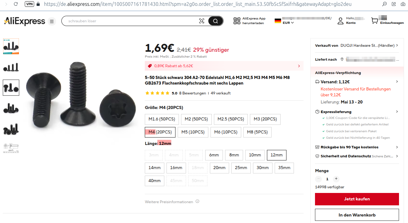 Die TORX-Schrauben gibt 's günstig bei Aliexpress: