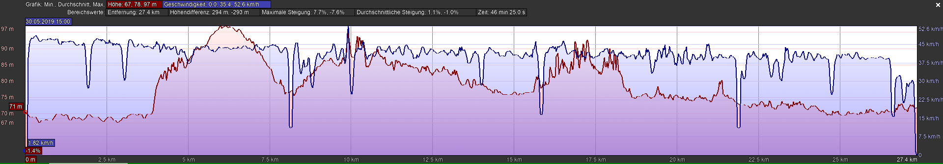Wobei nach ca. 10Km die Anfangsgeschwindigkeit von 46Km/h auf 41Km/h sank.
