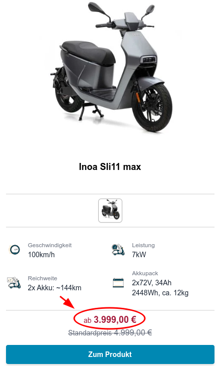 Inoa S5-Li + 2. Akku + 2 Ladegeräte mit je 7A => Original 4A-Lader verkauft. 11/2023 12A China-Ladegerät gekauft und umgebaut. Seit 11/2022 Tuning-Controller verbaut. Windschild (empfehlenswert) seit 03/2022. Gesamtpreis per 01/2022: 2.930 €.