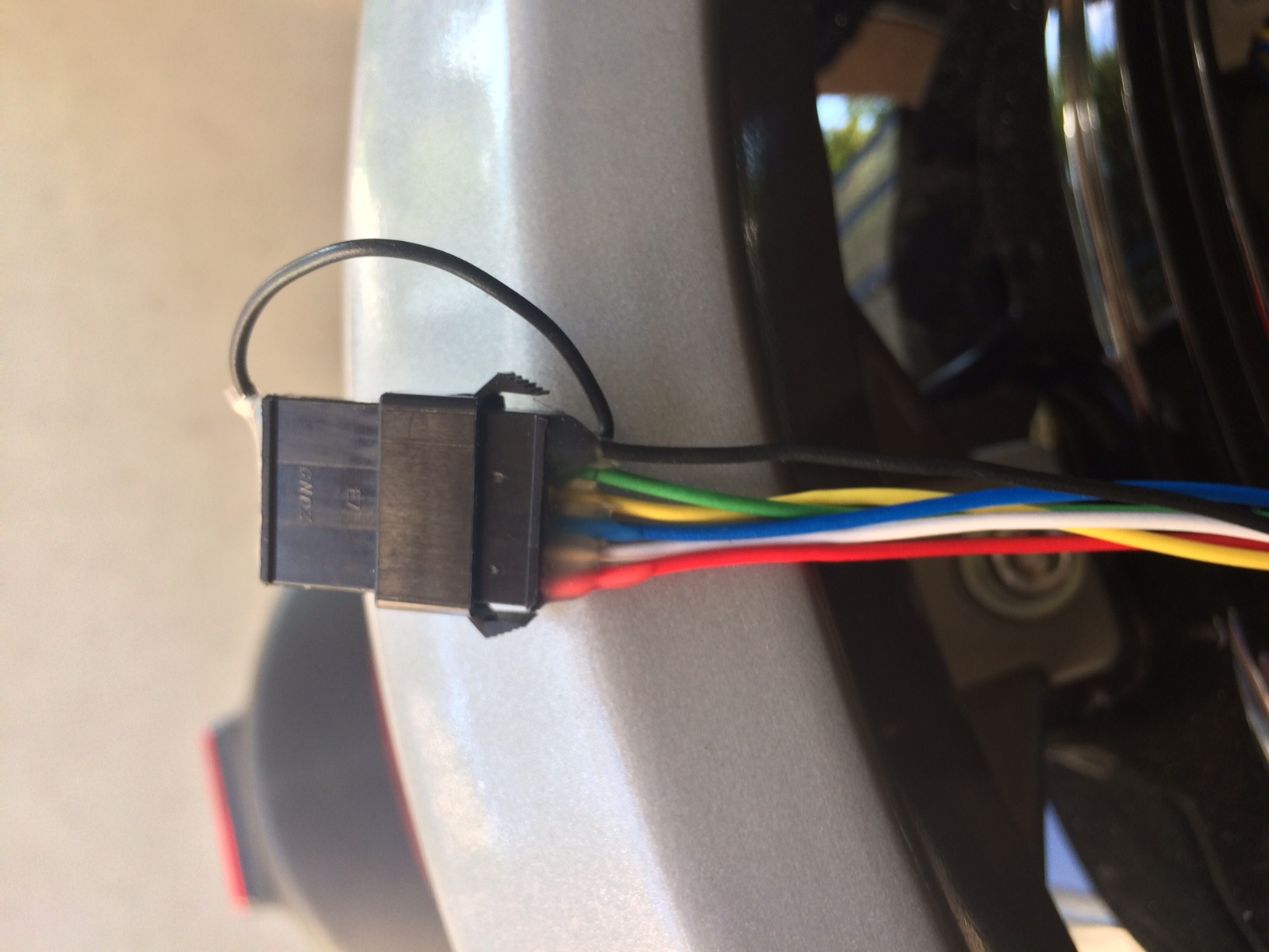 Schwarzer Flachstecker, war bei mir auf Höhe der rechten Blinkers von unten/aussen aus der Radmulde zugreifbar (damit man nicht immer den Sitz abbauen muss.