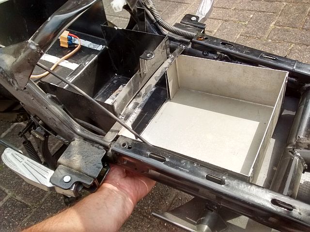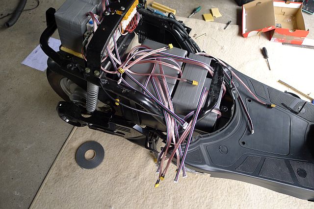 Ich habe aber noch vor dem unterem Akkufach unter der Trittfläche einen zusätzlichen Akkukasten eingebaut der drei 40Zeller aufnimmt. So habe ich noch das gesamte Helmfach frei. Für den Anschluss der Akkus und der Ballancerstecker habe ich noch ein Anschlussterminal mit Steckverbindungen eingebaut.