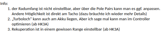Das display bekommt die kmh Daten vom Controller gesendet. Es werden keine rpm oder Hallfrequenzen übertragen. Nur der reine kmh Wert. Es mag sein, dass die neuen Tachos hier einen linearen Korrekturwert einprogrammiert haben. Aber Fakt ist es kommt ersteinmal alles vom Controller.guewer hat geschrieben: ↑Fr 5. Mai 2023, 00:49... Parametereinstellungen im TACHO tatsächlich die Geschwindigkeitsanzeige festgelegt wird und daraus die Genauigkeit der Enfernungsmessung resultiert. Es stimmt also, dass ein anderer Tacho (z.B. ein Neukauf bei Nova Motors) mit anderen einprogrammierten Werten den Geschwindigkeitsfehler behebt.