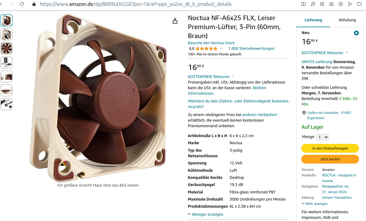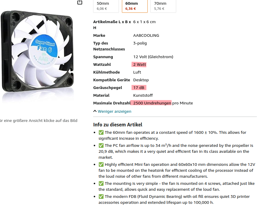 Allerdings weiß ich nicht, ob 2.500 U/min. nun außerordentlich langsam oder schnell für einen Gehäuselüfter dieser Größe ist. UND: Er ist nur 10 mm dick. Weiß nicht, ob das nicht den Luftdurchsatz vermindert, denn die Lüfterflügel haben dann ja auch weniger Fläche.