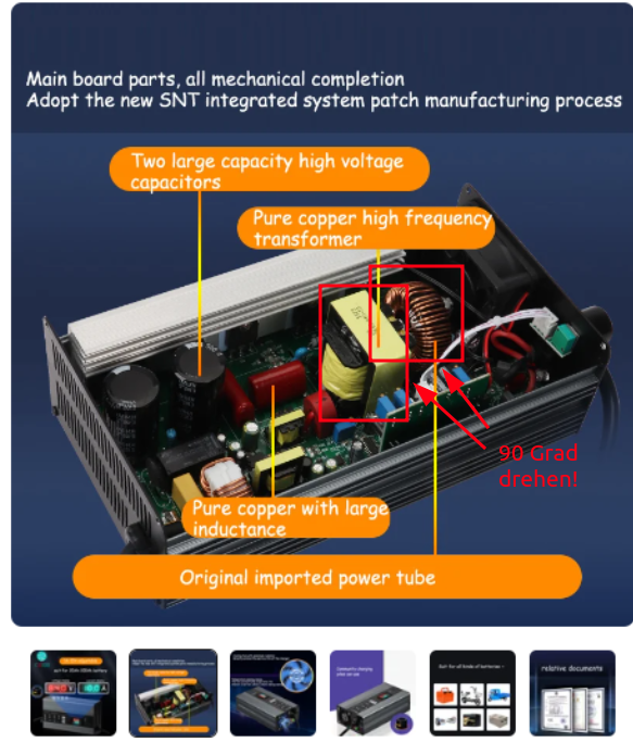 Außerdem, wenn man sich das innere Boarddesign vom Ladegerät ansieht, kann man gleich 2 kapitale Fehler, was den Luftstrom anbelangt, entdecken: Und zwar müsste die Kupferspule, genau wie der Trafo, um 90 Grad gedreht werden. Denn dann würden beide nicht mehr quer zum Lüfterstrom stehen, und der Durchfluss wäre viel besser. Auch würden weniger Verwirbelungen und somit weniger Lärm entstehen.