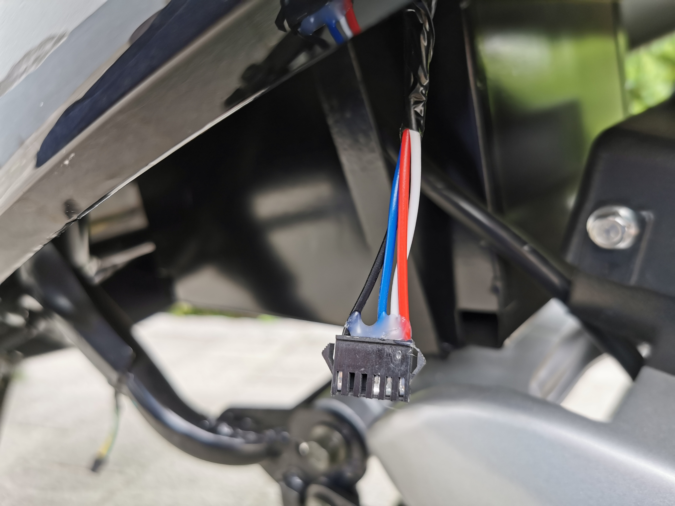 4. Der 6-polige Controller-Stecker befindet sich im großen runden Loch unter der Sitzbank. Ist ein Gefummel ihn raus zu bekommen. Wichtig: Während der Programmierung bleibt der Roller aus. 4 Kabel zwischen den Adapter und dem Controllerstecker: 3V3 auf rot; GND auf schwarz; Tx auf blau; Rx auf weiß. Grün und Gelb bleiben frei. Bezeichnung am USB Stecker.