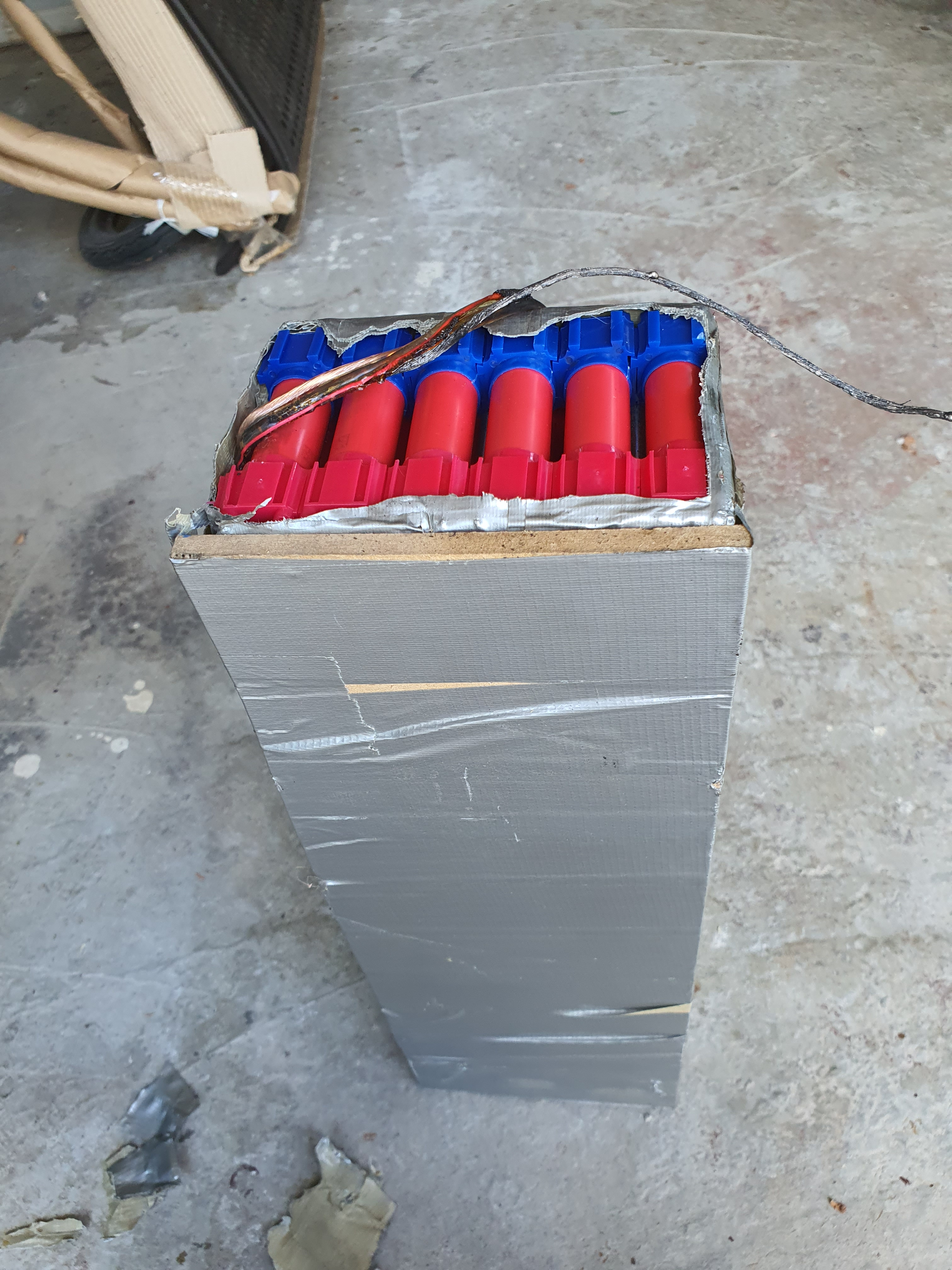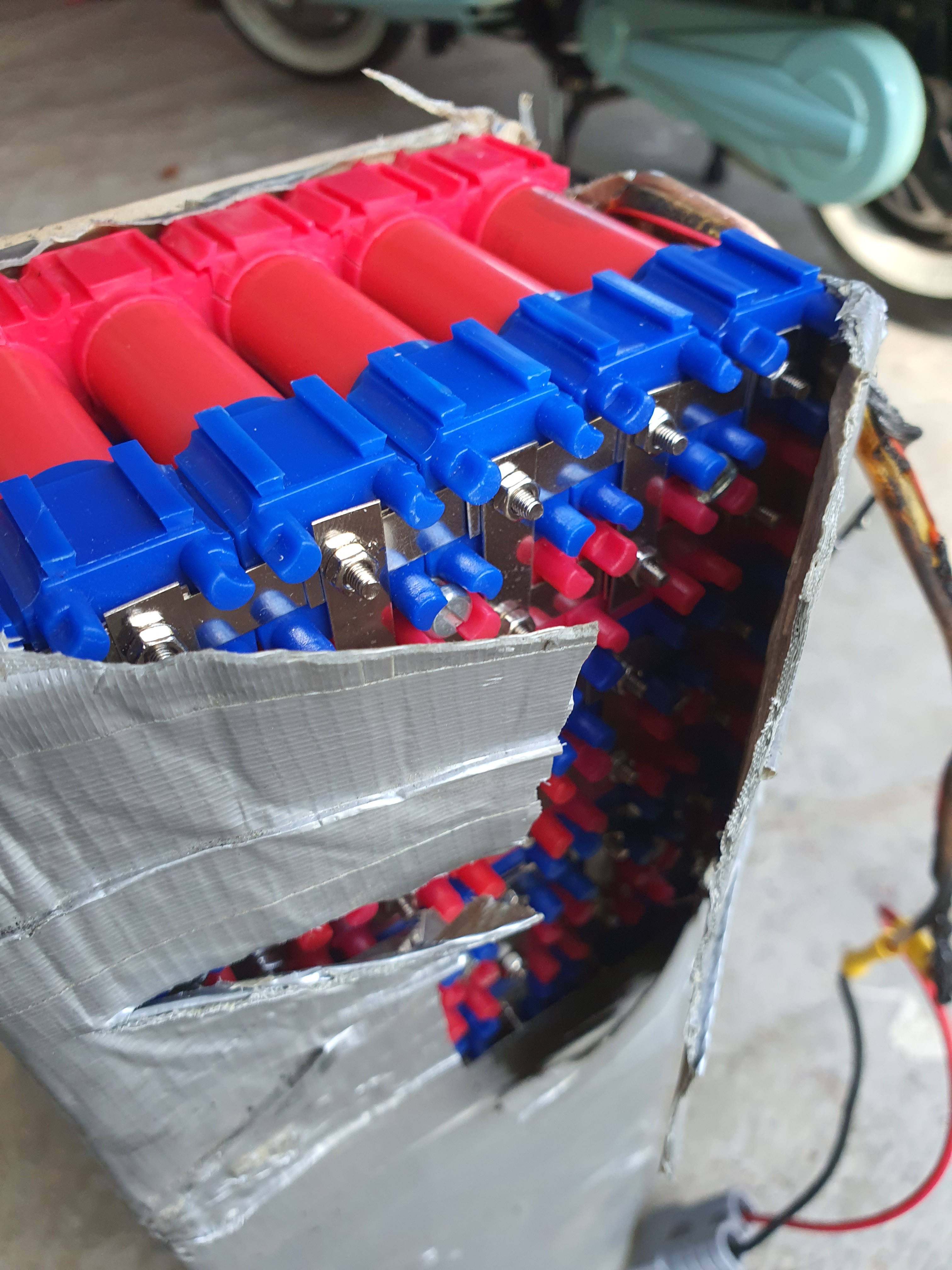 Offenbar hat da schon Jemand mal die Ur-Akkus gegen etwas neu Gebasteltes getauscht. Nur leider war die Verkabelung nicht sicher. Das sieht für mich aus, als hätten die Hauptstromkabel (vielleicht durch Scheuern beim Fahren) einen Kurzschluss gehabt. Egal was es für ein Akku war, der wird "hinüber" sein. Die Art erkenne ich aber nicht. Evtl.ein 21s 6p, aber Technologie unklar. Wenn in dem Plastik Lithium-Zellen stecken, würde Alle die keine 2,5 Volt-Ladung mehr haben, dem Recycling zuführen. Da es ein 72 Volt -Motor ist, wären 23s oder 24s LFP möglich (6.500mAh Schraubzellen) oder falls Li-Ion 20s oder 21s.