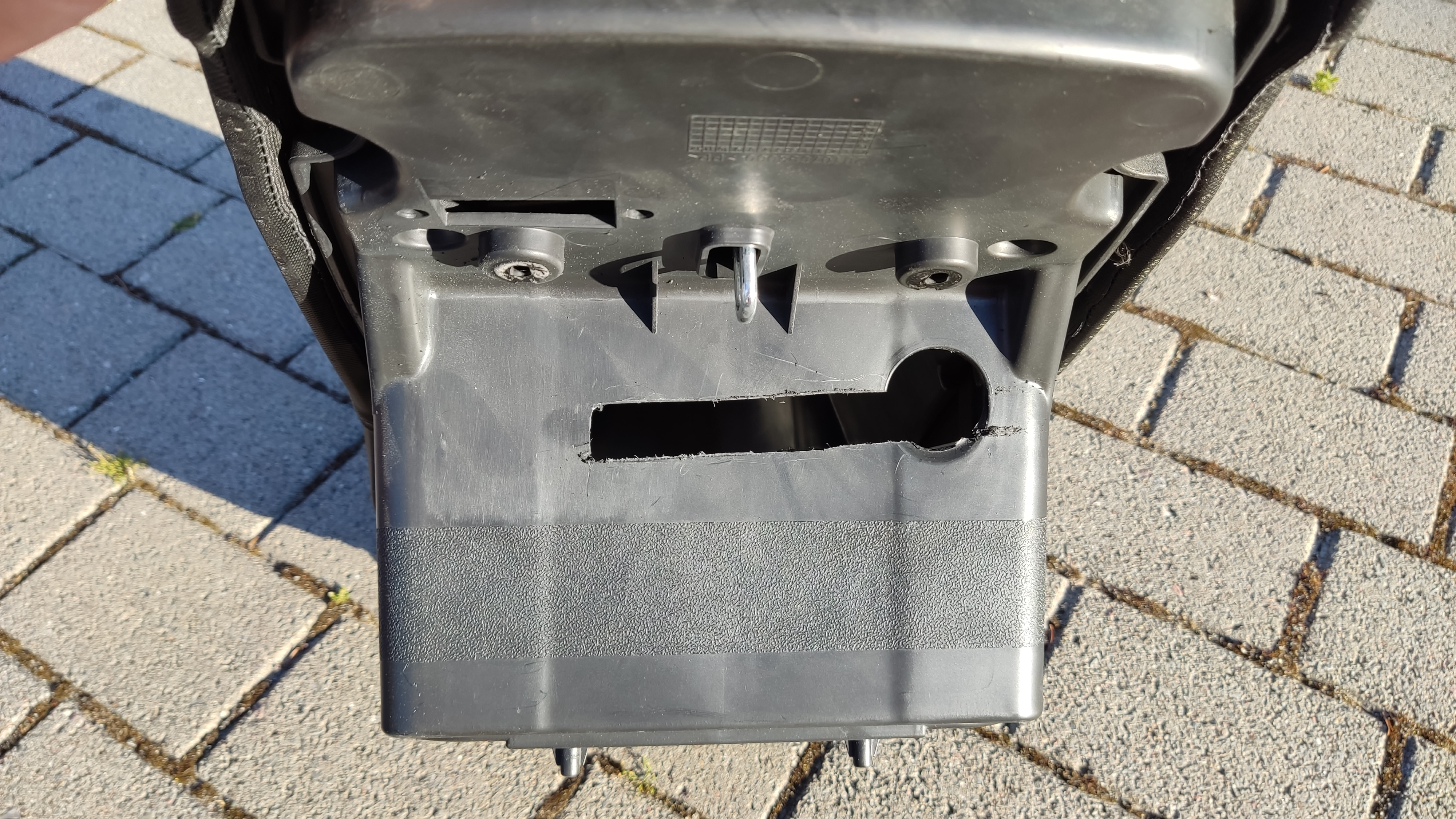 Das "Helmfach" hatte ich dafür ausgebaut, damit man besser rankommt. (nur vier Schrauben mit 10er Nuss, die zwei Muttern von der Sitzbank und die sechs Kreuzschlitzschrauben vom Akkubehälter sind zu lösen)