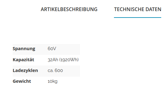 Wäre schon interessant von der Reichweite her. Mit dem 1.404 Wh-Akku des SLI-5 kommt man real ca. 50 km weit. Mit 1.920 Wh (32 Ah x 60 V) käme man dann rechnerisch fast 70 km weit. Bei zwei dieser stärkeren Akkus doppelt reingepackt 140 km.
