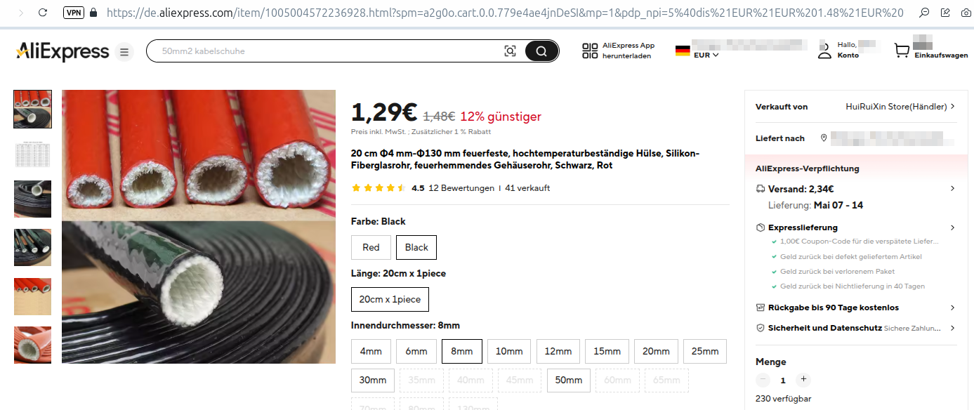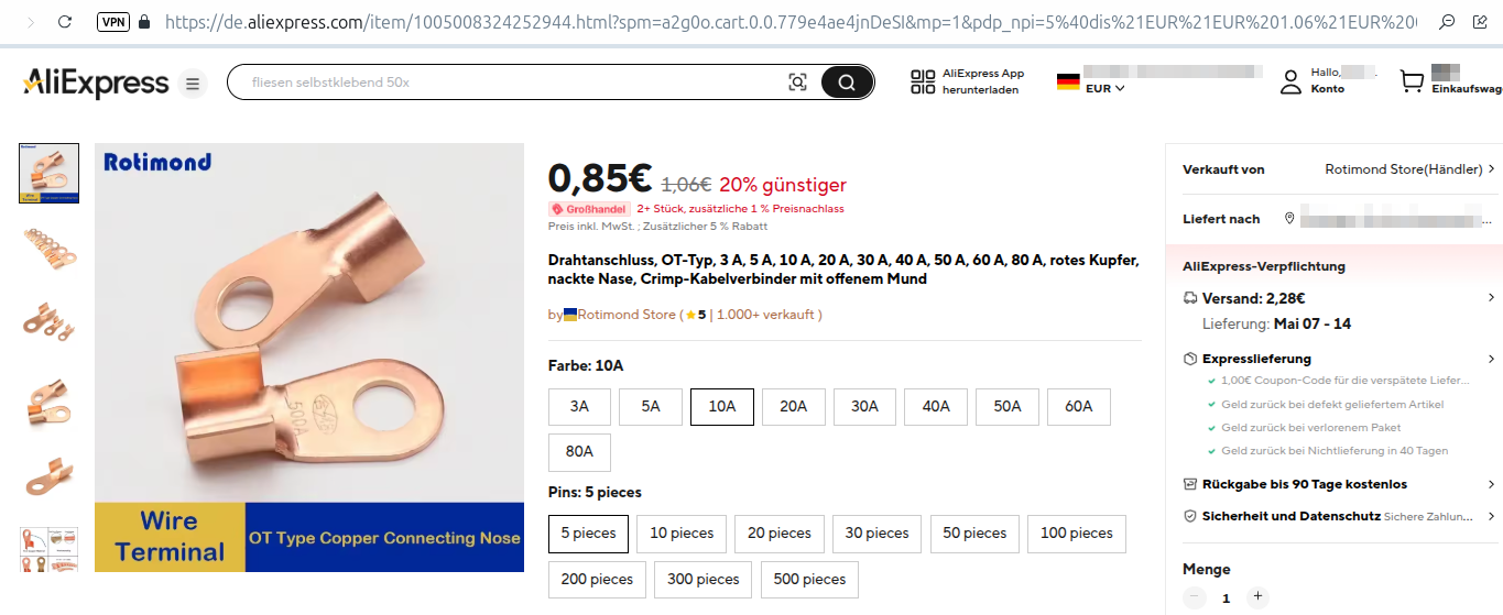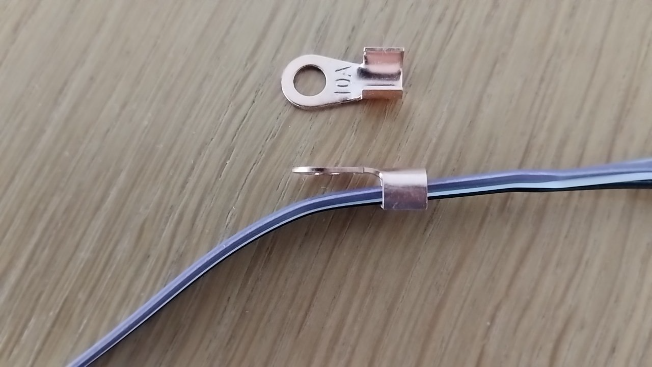 - Man könnte einen Kabelschuh aus Kupfer (oder Kupfer/Messing-Legierung) daran crimpen, wegen der besseren Leitfähigkeit von Kupfer. Den gäbe es bei Aliexpress. Wobei ich sagen muss, dass ich noch nie etwas professionell gecrimpt habe. Und das muss ja auch halten und passen.