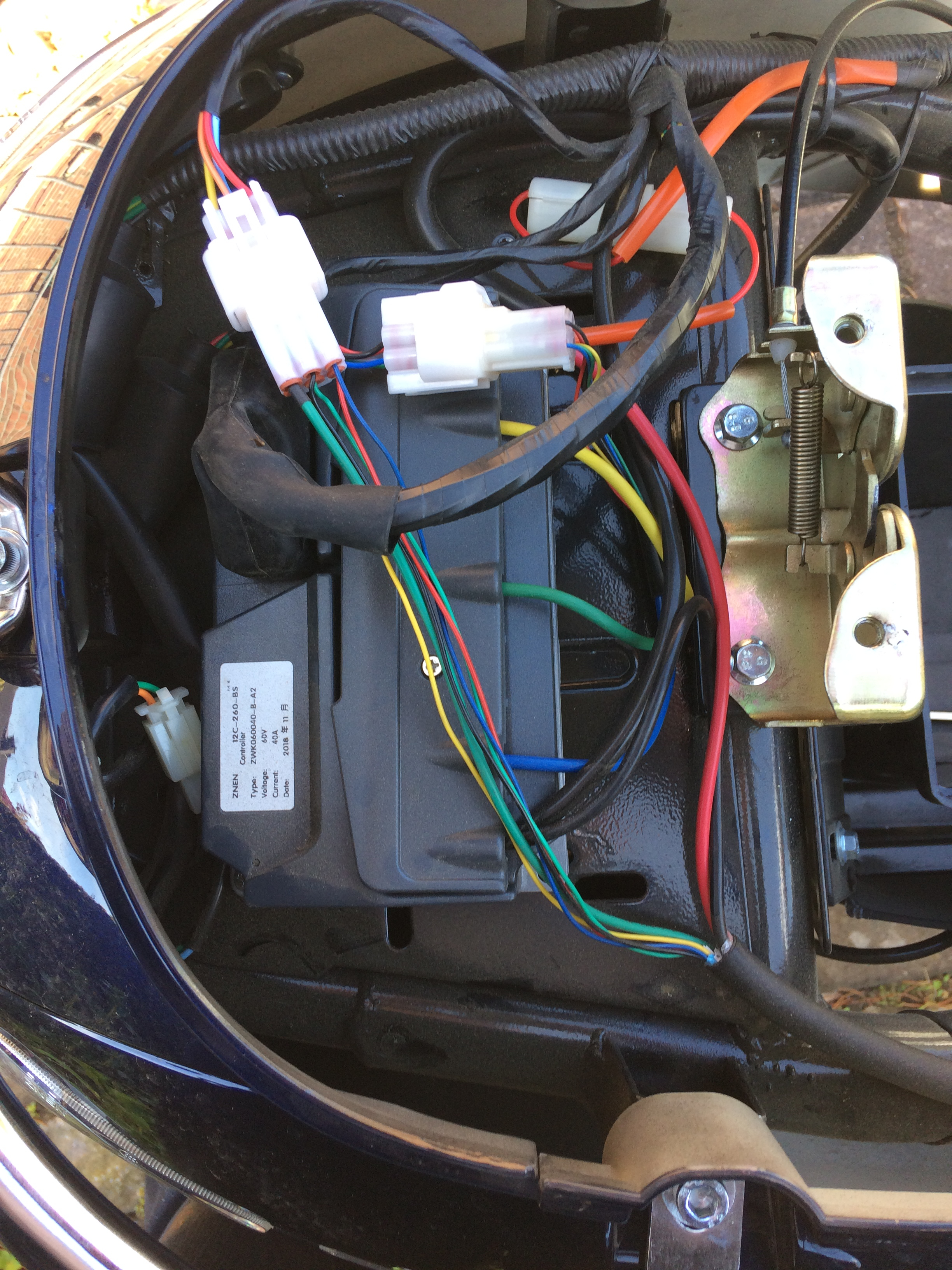 - Die dicken Pins 1 "Plus" und 2 "Minus" sind die 60V Spannungsversorgung des Rollers.