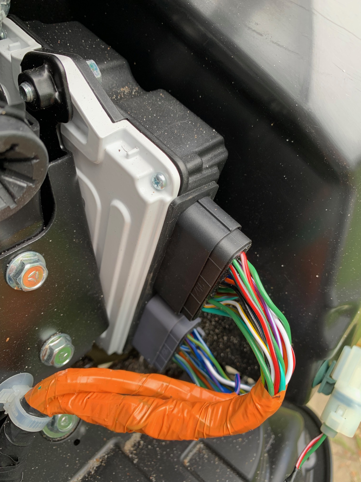 Anbei die Fotos von dem Umbau. Der Controller ist vorne hinter dem Vorderlicht eingebaut. Zum Ausbau muss die vordere Verkleidung abgenommen werden. Das meiste ist über Klipse befestigt. Da muss man etwas vorsichtig sein, damit die nicht abbrechen.