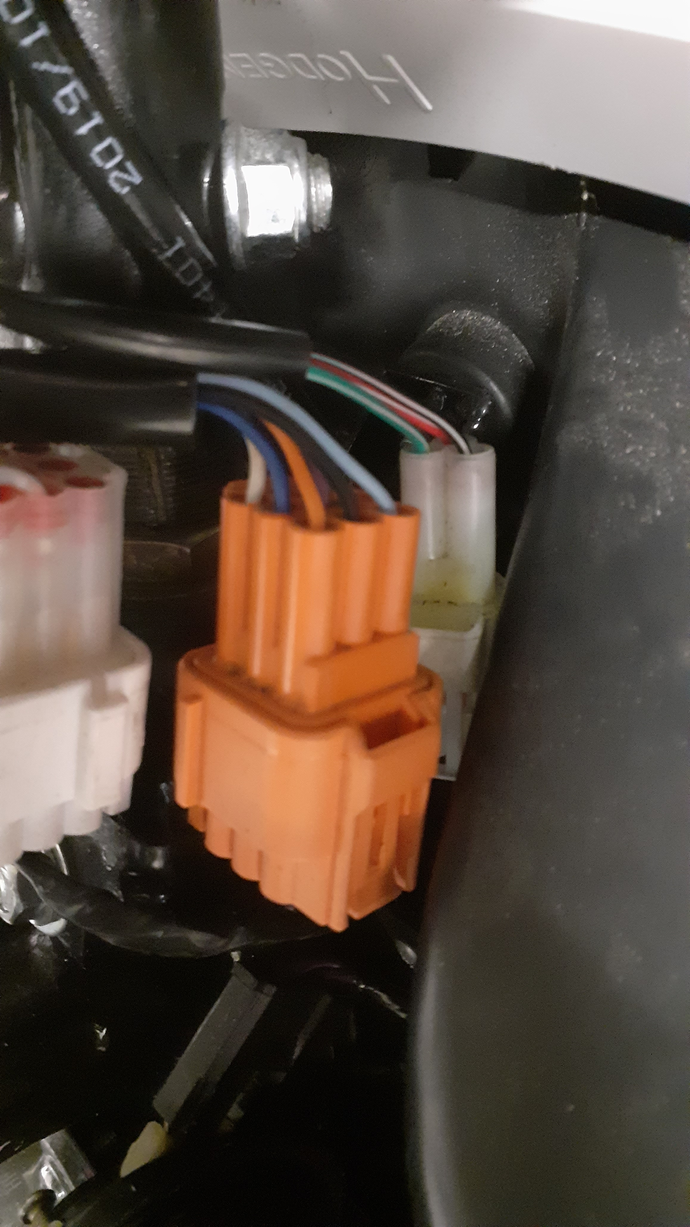 Nun habe ich mal alle Steckverbindungen abgezogen, mit Druckluft durchgepustet und alle Kabel entwirrt. Nun sind sie nicht mehr verdreht und haben genug Platz und Länge, um sich locker zu bewegen, wenn der Lenker voll nach links und rechts eingeschlagen wird. Alle Steckverbindungen werden mit bewusstem KLICK Geräusche zusammengesteckt und mit wenigen Kabelbindern festgemacht.