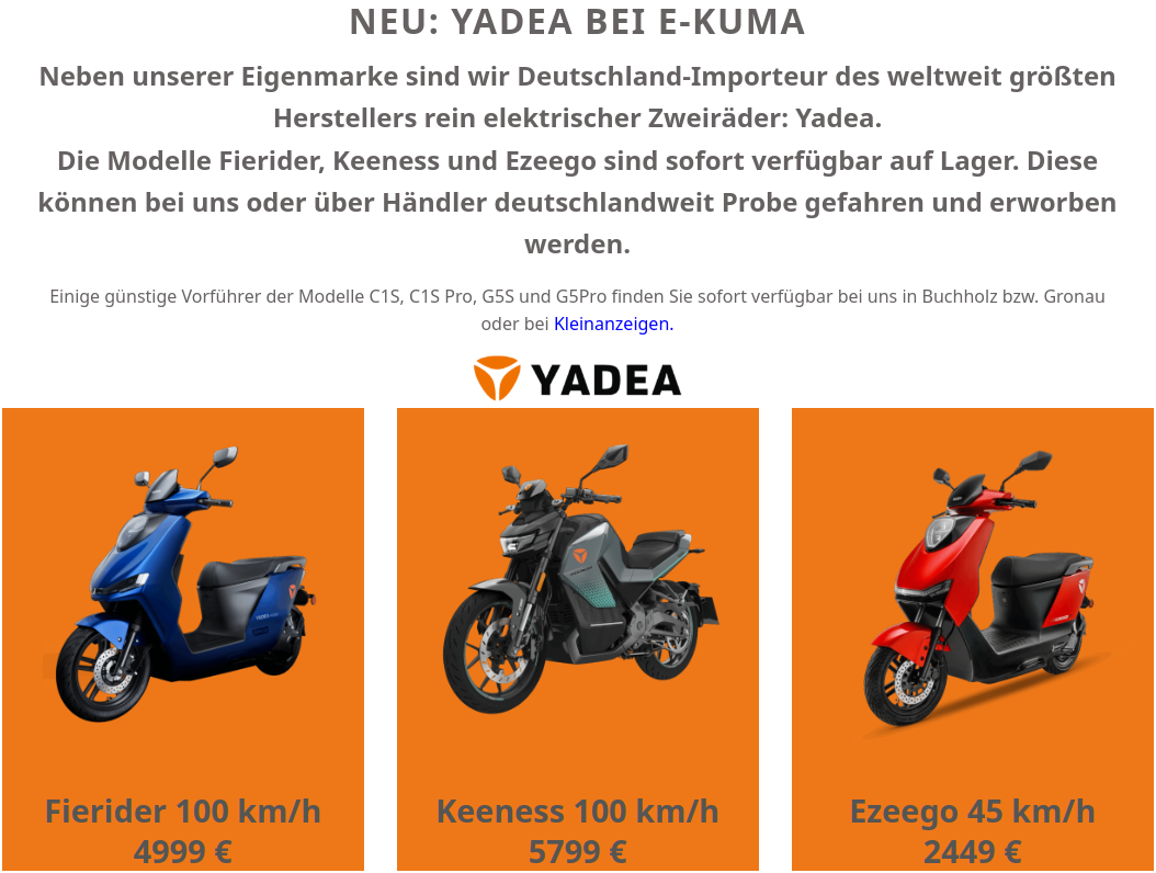 Das ist eine Überraschung: E-Kuma in Buchholz in der Nordheide ist jetzt Deutschland-Importeur für Yadea! Das kann man bei Yadea und bei E-Kuma auf der Homepage lesen. Herzlichen Glückwunsch an den Geschäftsführer Christian Kunz! Wenn E-Kuma das hohe Niveau bei Service und Erreichbarkeit halten kann, ist das bestimmt ein Gewinn. Drei Modelle sind zurzeit lieferbar, aber es werden sicher noch mehr.