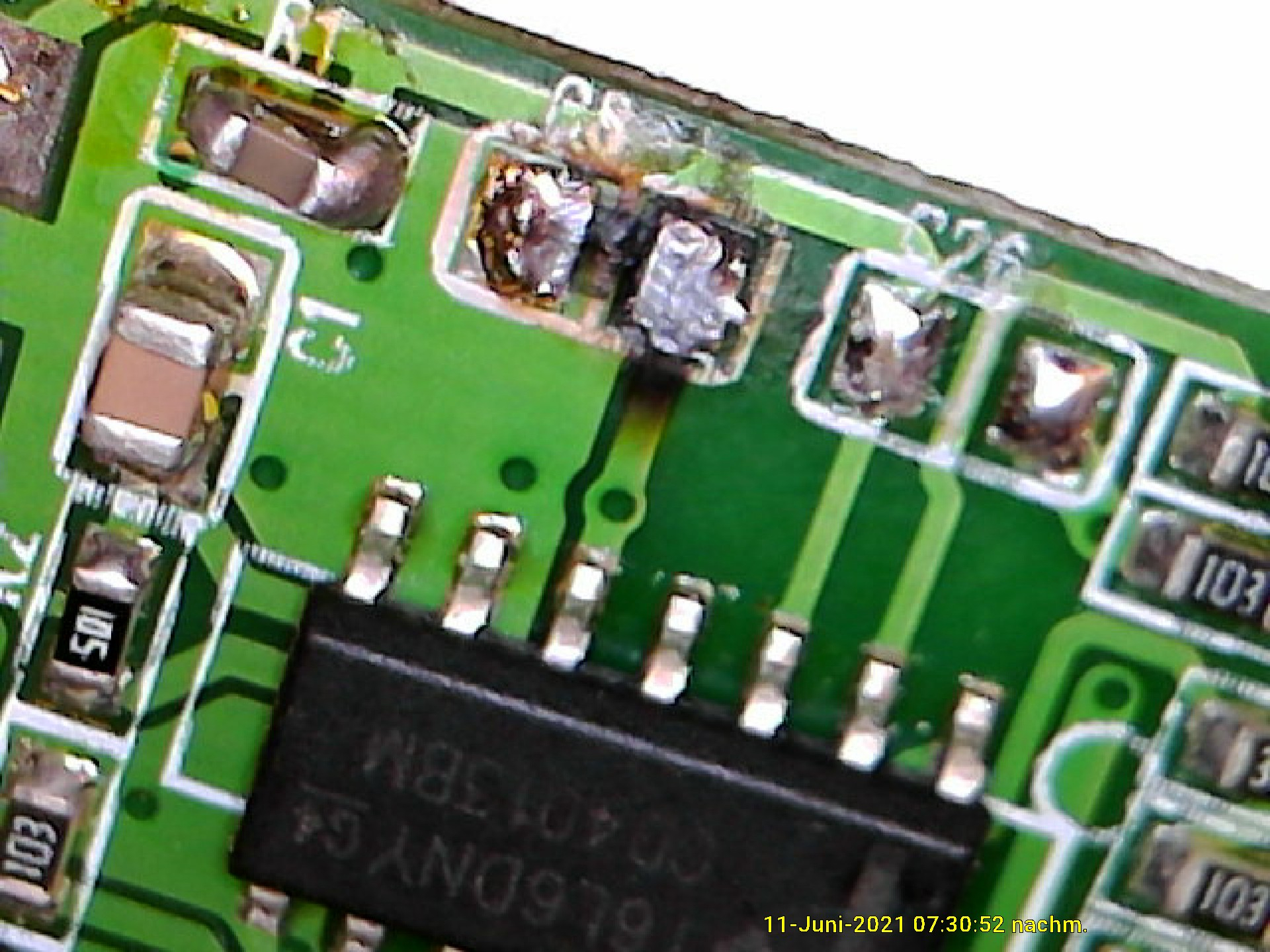 Scheint die Steuerung für Blinker links, rechts und Warnblinker zu sein. Beim testen nochmal kurz kurzschliessen ein SMD Baustein oder Dreck der da irgendwo angehaftet hat verglüht und zerfällt beim befingern zu Staub. Jetzt geht wieder alles. Bezeichnung wahrscheinlich C5 an der Stelle, könnte für Kondensator stehen?