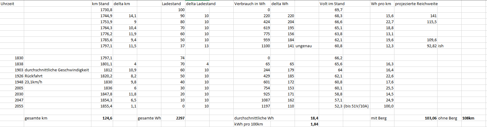 Was haben wir gelernt? Ich bin abermals nicht komplett stehen geblieben, Top! , die Leistungsreduzierung setzt erst sehr spät und selbst dann rollert man unter normalen Bedingungen noch mit 25km/h durch die Gegend, TOP! Ich konnte im Schnitt 18,4 Wh/km in hügeligem Gelände realisieren, Absoluter Wahnsinn soweit es mich angeht. Bei meiner entnommenen Menge reicht das für 95 km (der bestimmte Wert hat einige Ungenauigkeiten und wurde aus zwei Chargen zusammengebastelt), bei Nennkapazität des Akkus sollten 103 bis 108 km möglich sein. 100km sind ganz knapp, im flachen ohne gross Wind aber ziemlich sicher erreichbar. Betrieb als serieller Hybrid zwar nicht getestet, kalkulatorisch ist ein Betrieb bis etwa 30km/h bilanziell positiv bis neutral, darüber agiert er als Reichweitenerhöher. Spritverbrauch bei 30km/h etwa 1,5 l/100km. Darüber, darunter sozusagen. Im Automobilindustrielügenmix dann deutlich darunter. Fairerweise muss man die Generatorstunde jedoch mit 3 Eur ansetzen und dann wird es eine wirtschaftliche Katastrophe.
