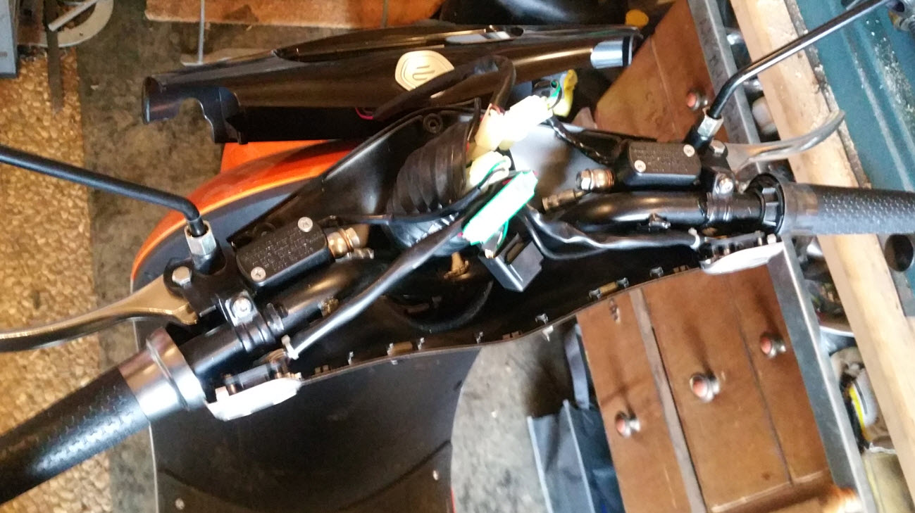 Es ist alles überraschend wertig verzurrt, aufgebaut und verlegt. Da war ich positiv überrascht. Sehr symphatisch fand ich im Lenker, wie dort die Stecker zusammengefasst wurden. Es ist eine Gummiachsmanschette von irgendeinem Auto. Funktionieren tut es jedenfalls und da hat sich jemand echt Mühe gegeben alle Stecker da rein zu stopfen. Interessant ist auch, dass er offensichtlich vorbereitet für verschiedene Länder ist. Es gibt jedenfalls einige Stecker die unbenutzt sind und wo man durch umstecken zB das Lichtverhalten ändern kann. Habe nicht alle nachvollziehen können. Da bekommt man dann auch sehr einfach Strom für Eigenbauten her...
