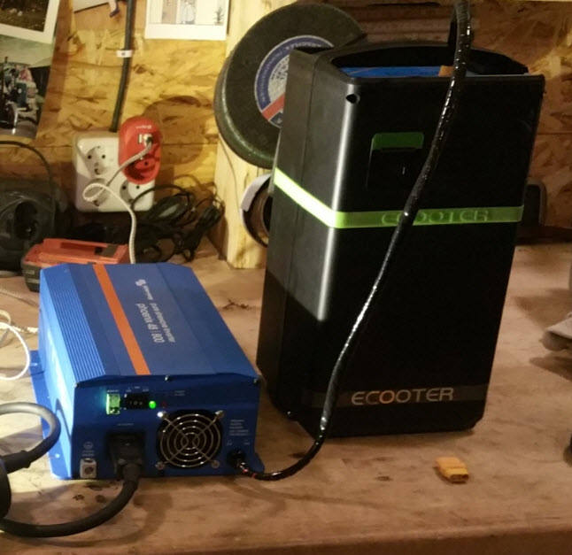 Geladen wird bisher mit dem mitgelieferten Ladegerät. Auf kleiner Stufe braucht es in der Spitze 300W aus der Steckdose was gut zu meinem Solarsystem passt. Für einen ersten Test lief es an einem Victron Phoenix 375VA Inverter der damit am Limit läuft. Beim umschalten auf die Schnellladung steigt er aus, da kommen bald weitere Tests. Das gefällt mir schonmal sehr, denn damit kann das Projekt Zweitnutzung des Akkus weitergehen. Genau jenen 375er hab ich auch im Auto und bekomme ihn dann also schonmal geladen während der Fahrt zum Campingplatz von wo es dann ggf weiter per Zweirad geht.