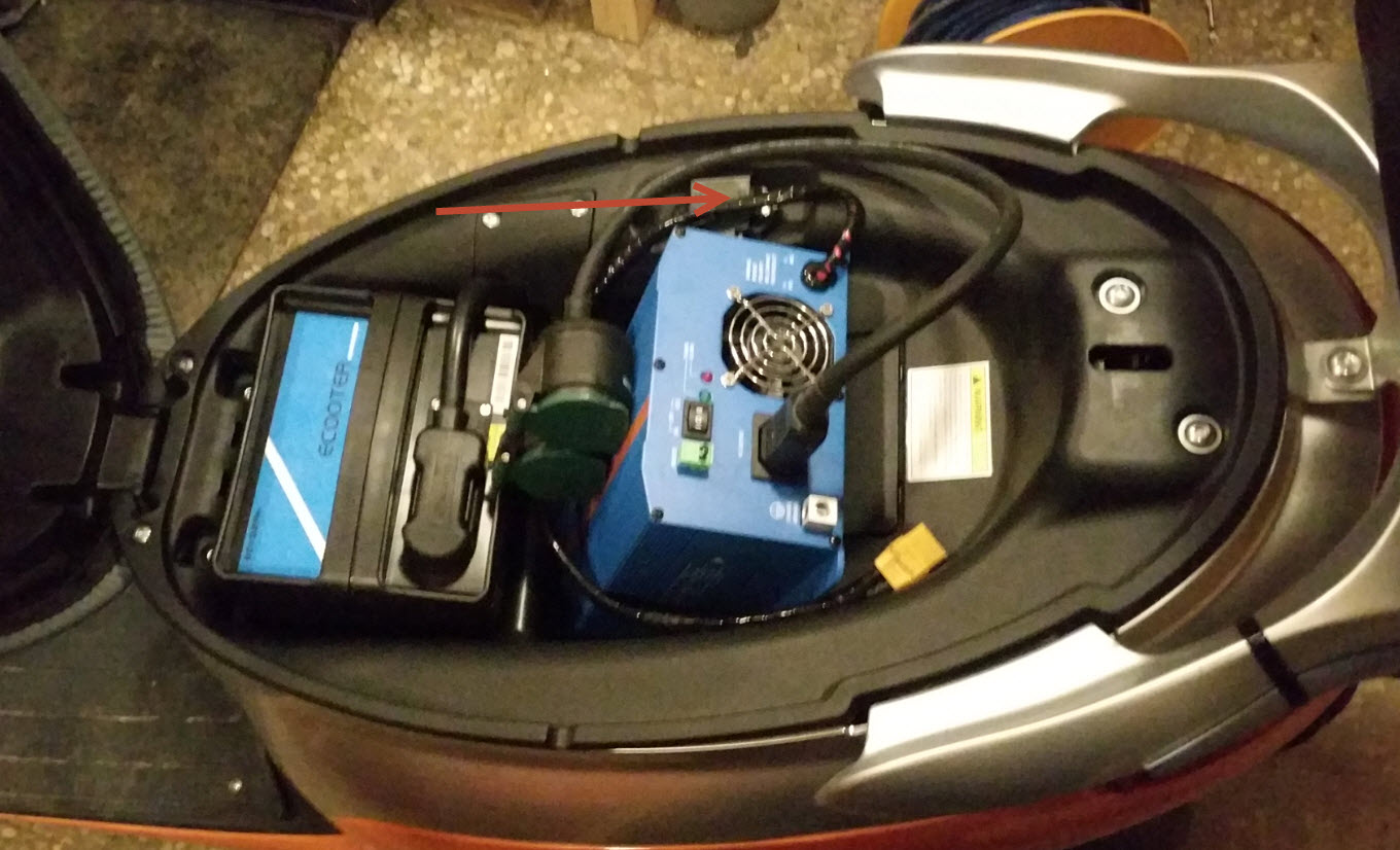 Hier der Akku und der Inverter zum Grössenvergleich und hier der Blick unter die Sitzbank Der rote Pfeil deutet auf die Buchse wo das Ladegerät reinpasst. Man muss also das Kabel vom Akku gar nicht abziehen wenn man im Roller laden möchte. Ein Helm passt auf jeden Fall beim besten Willen nicht da rein. Höchstens ein bisschen Zeug, ist aber ne doofe Grösse für egal was ausser dem Inverter der genau reinpasst.