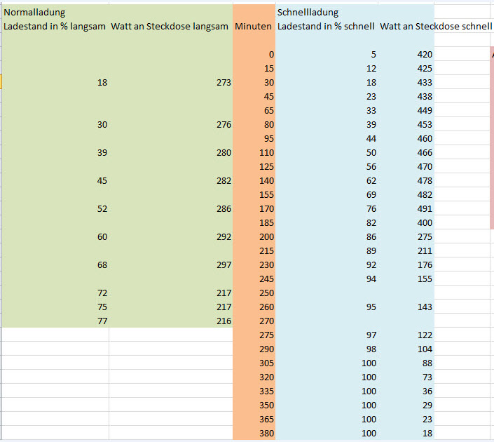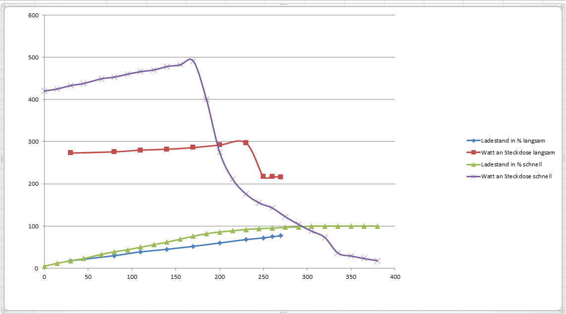 Dann habe ich mir den Spass gemacht und alle paar Minuten mal beim Laden zugeschaut. Excel skaliert irgendwie komisch, aber ich glaube so stimmt es. Man sieht, wie Normal und Schnellladung auseinandergehen und für mich wichtiger, die Leistungsaufnahmen. Ich lade mit Solar oder während der Fahrt mit dem Auto und habe da nur ein begrenztes "Budget".