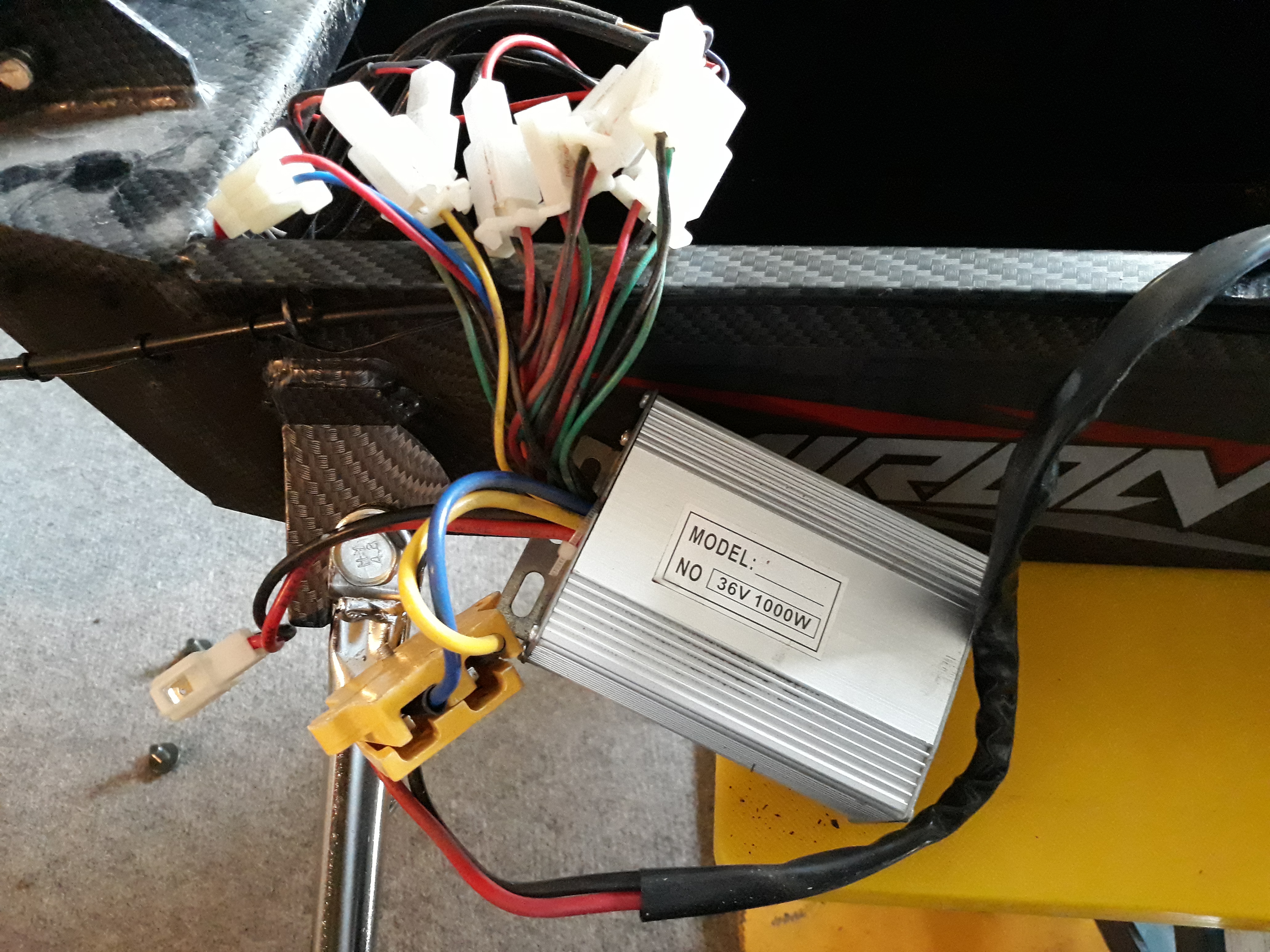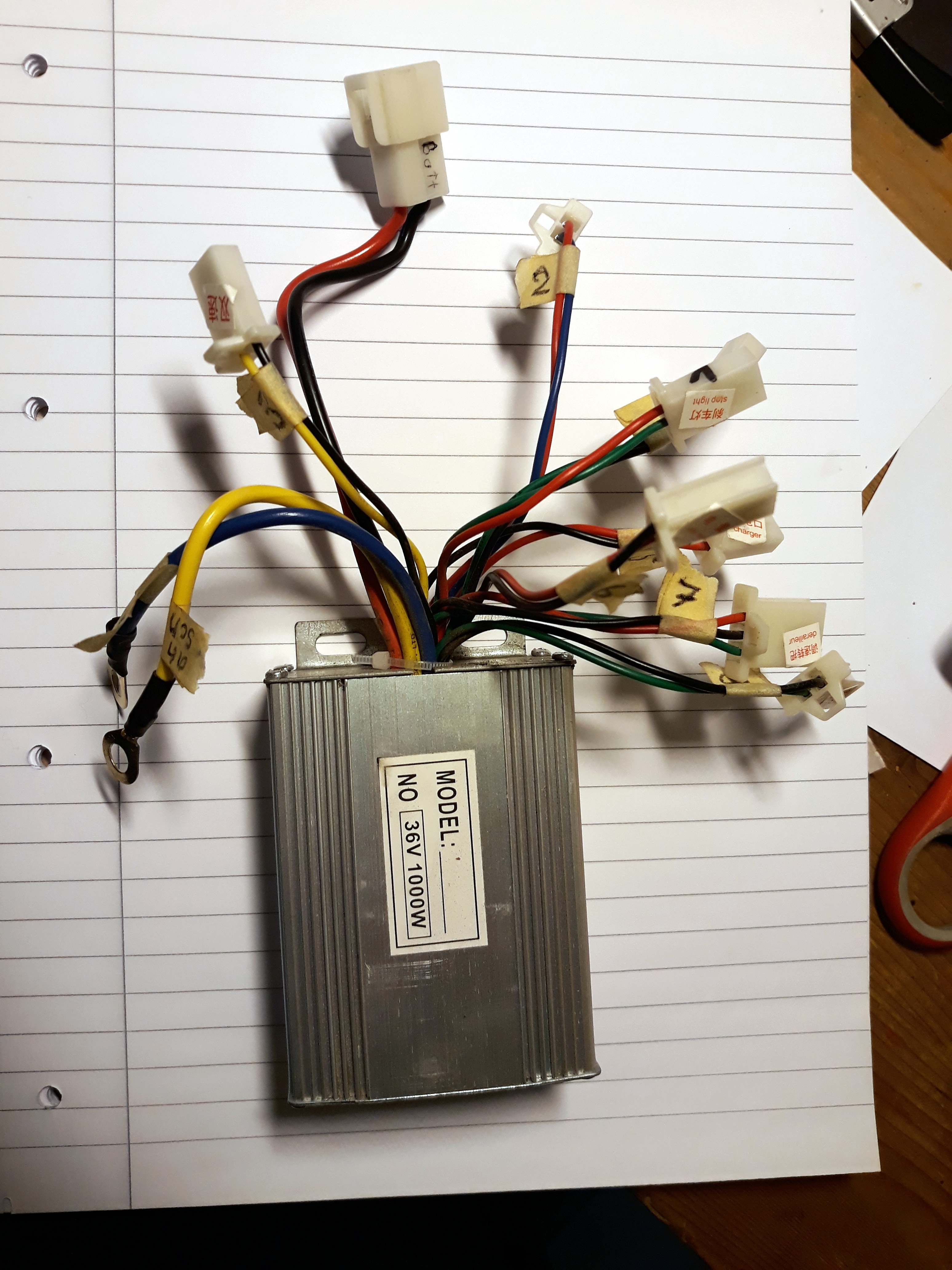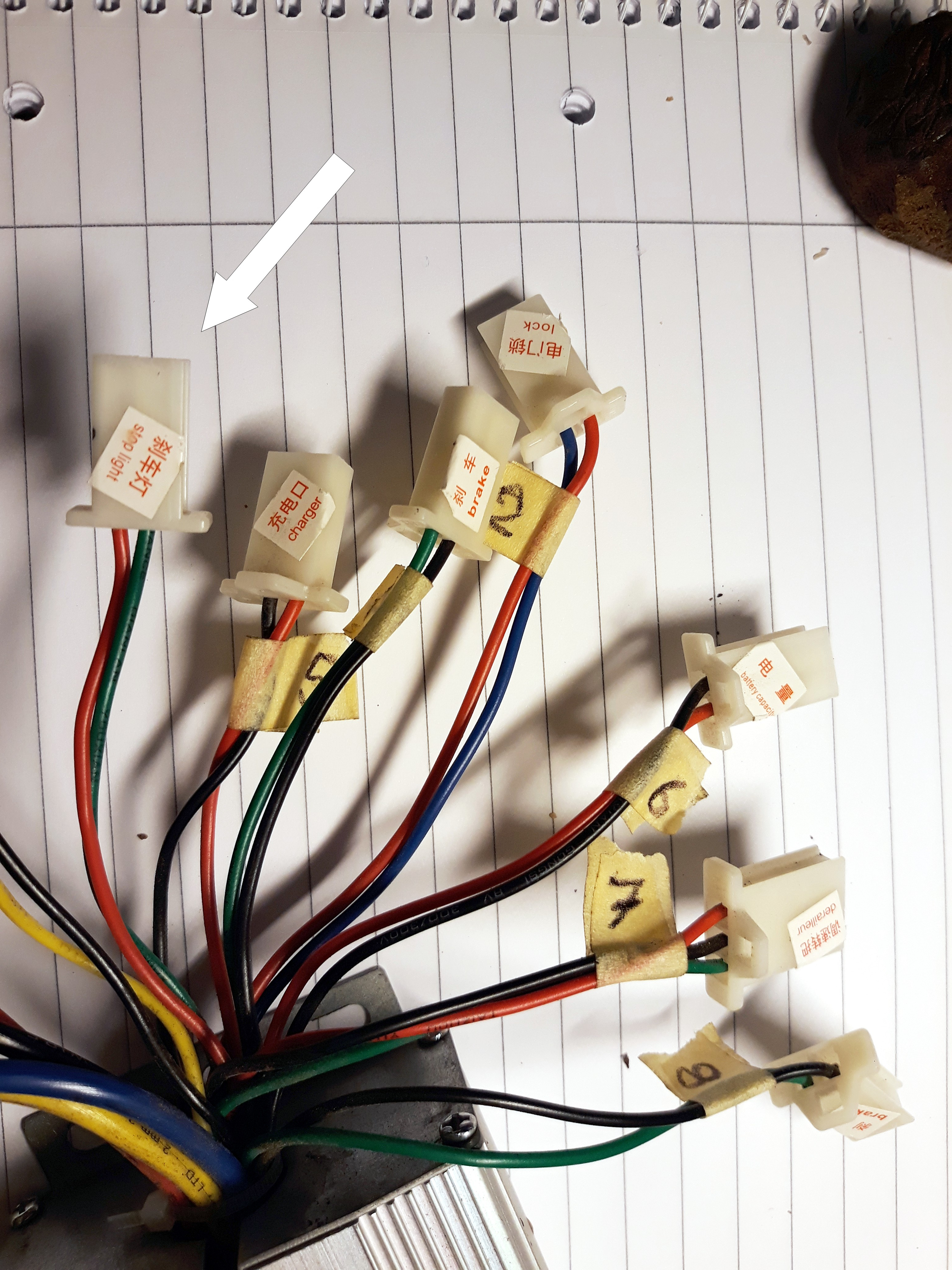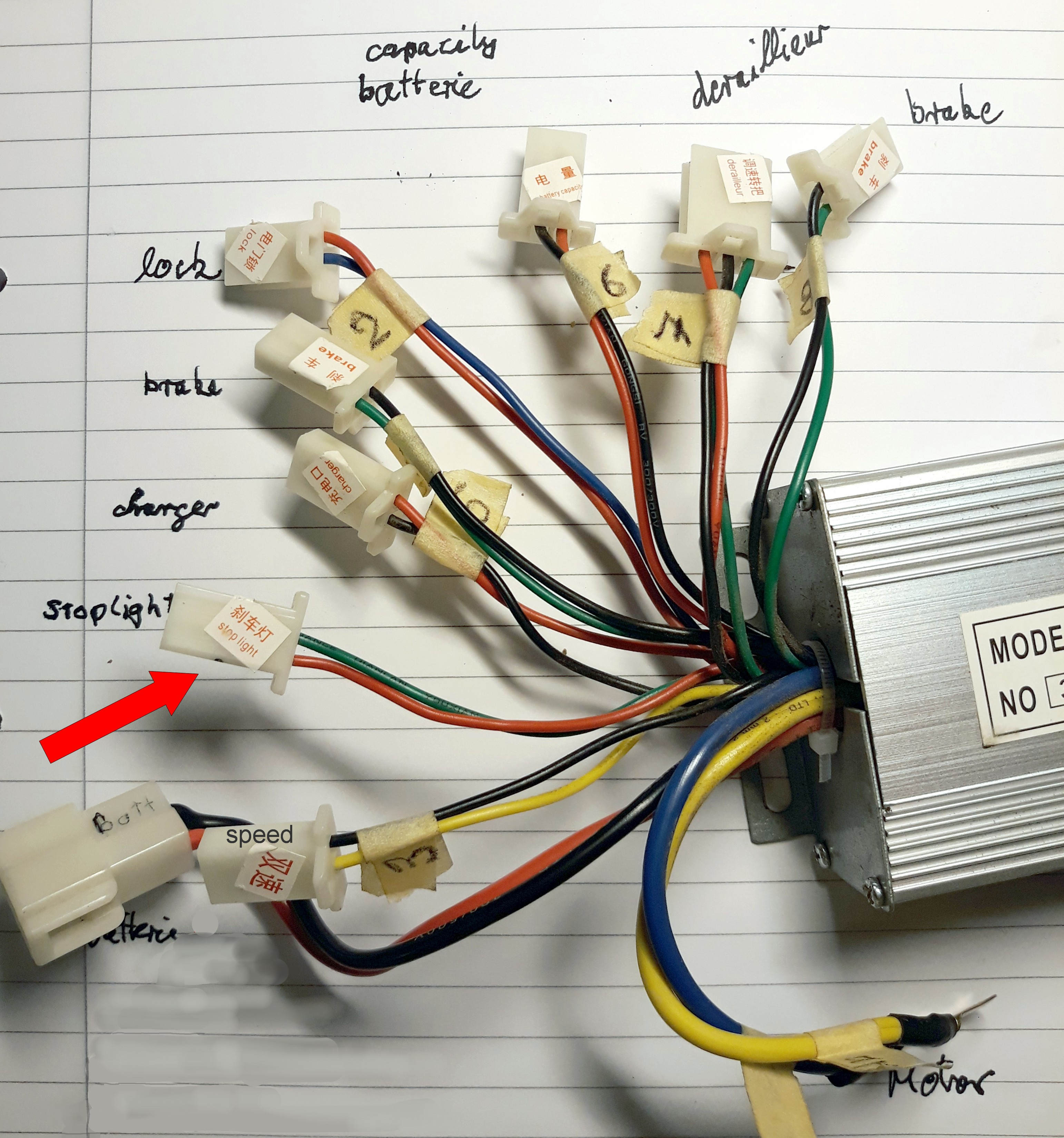 Ich habe nochmal ein neues Foto gemacht, wo man die Kabel vom Controller besser sehen kann. Der Stecker "stoplight" ist der einzige, der freibleibt, also wo in der Verkabelung des Rollers kein Gegenpol vorhanden ist. Ich glaube nicht, daß mein Controller kaputt ist.